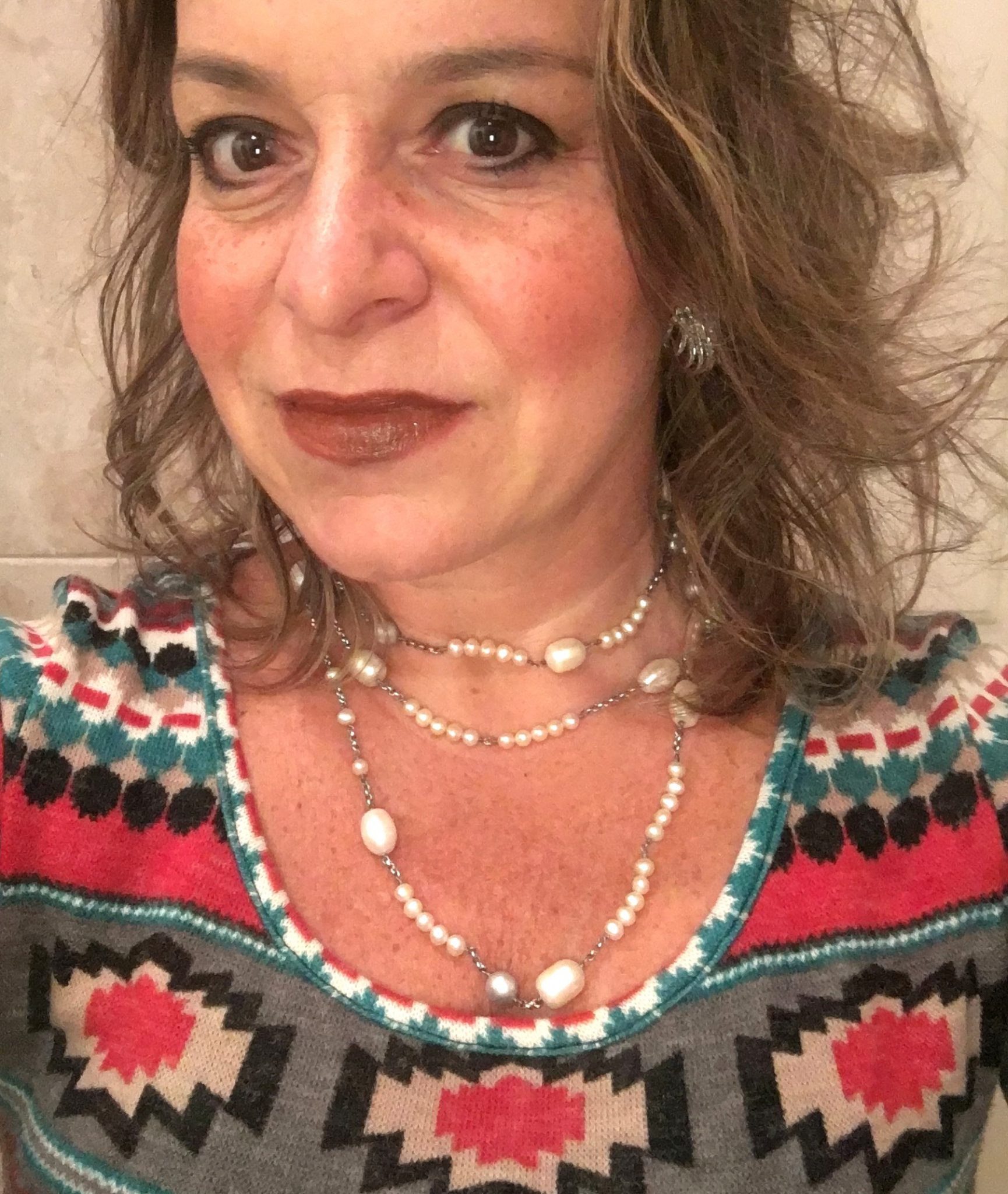 A renda veio da camisa CLÔ debaixo da blusa de cashmere