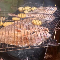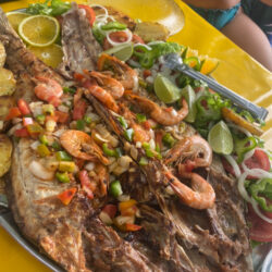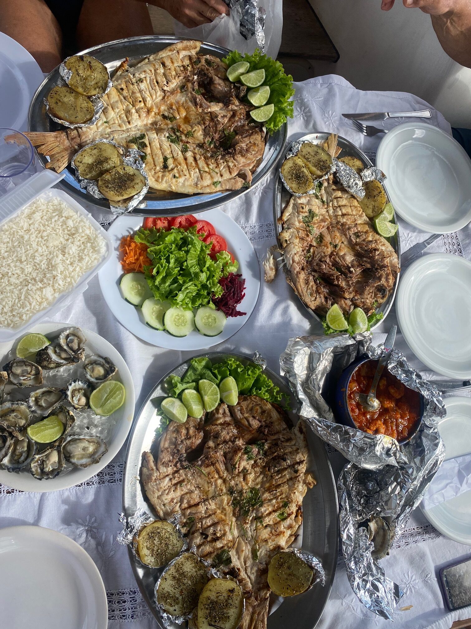 Nesse meio tempo, paramos em uma enseada para almoço e já havíamos encomendado peixe que chegou no barco trazido em um stand-up.
