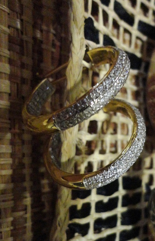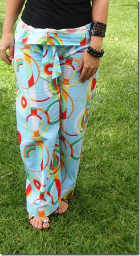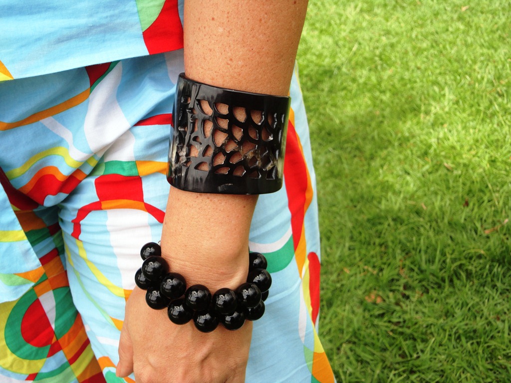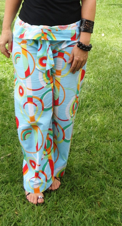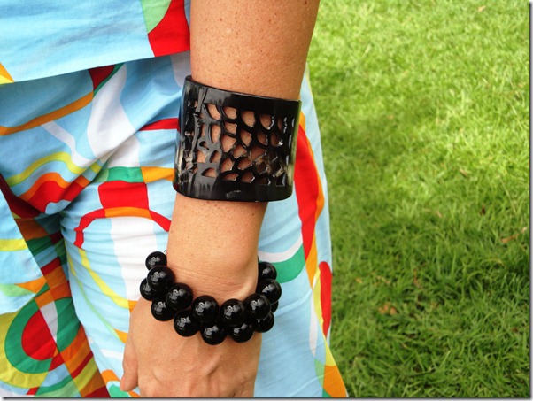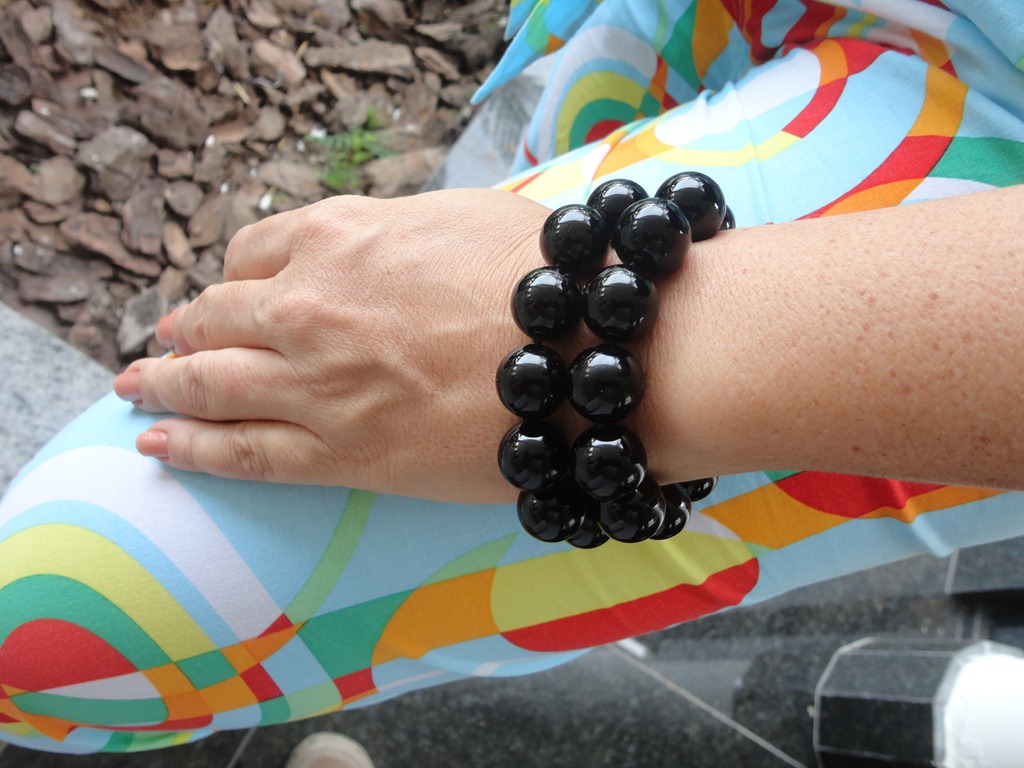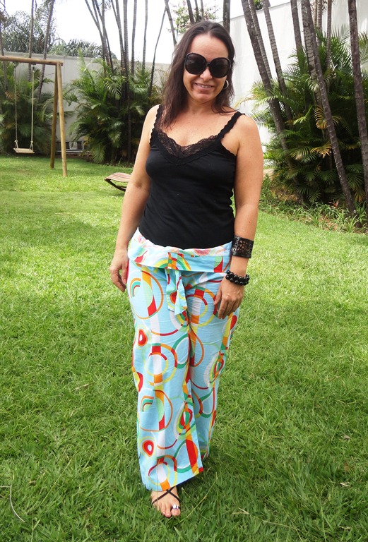 As calças estampadas estão por toda parte. Esses modelos larguinhos são ultra-conforto para ficar em casa. É importate manter a parte de cima sempre lisa. Como escolhi uma regatinha Hering preta ( como eu adoro Hering!!! ),completei com argola de brilhantes e pulseiras de bolas de ônix. No início,eu estava só com as duas.Quando mamãe chegou, me trazendo uma pulseira de osso preta de Punta, coloquei na hora e gostei do resultado.