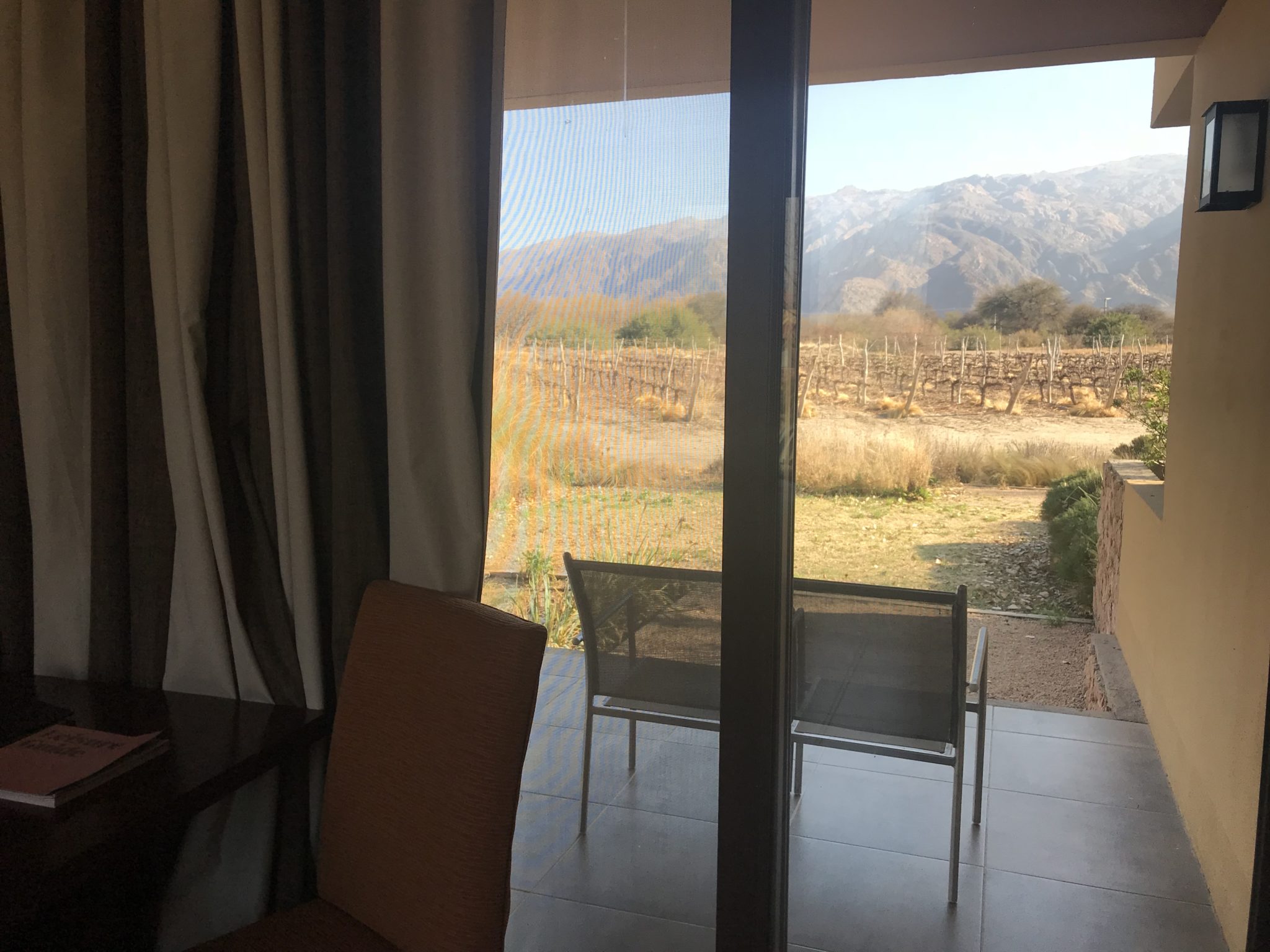 Peça um quarto com vista para as montanhas. Você vai ter tudo isso só para você. Até mesmo no banheiro essa é a vista e abrindo a porta da varanda você já se depara com as uvas. No inverno, as parreiras ficam secas, mas é lindo de qualquer jeito.
