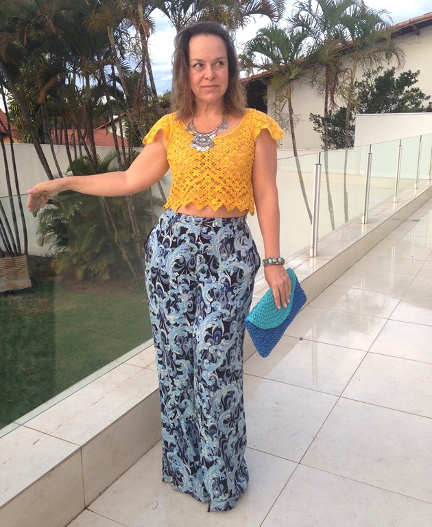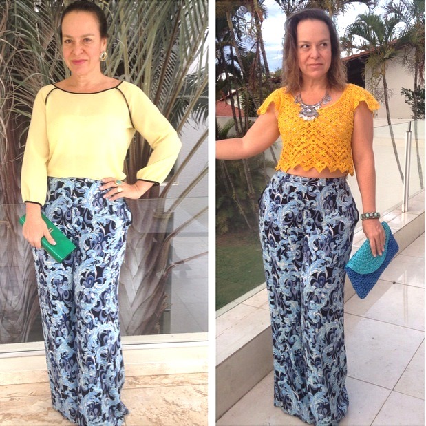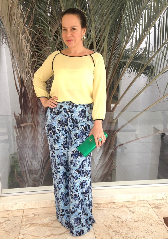 A mesma calça PUCCI de seda pode certamente ser usada em muitas versões. Conforme você vê nas fotos, podem ter inclusive conotações diferentes. Assim, na 1a., mais classy , usei com camisa de seda TAHARI e clutch verde MARCO APOLÔNIO. Na 2a. , já mais descoladona, usei com top cropped de renda do Nordeste e clutch de palha LE LIS BLANC.