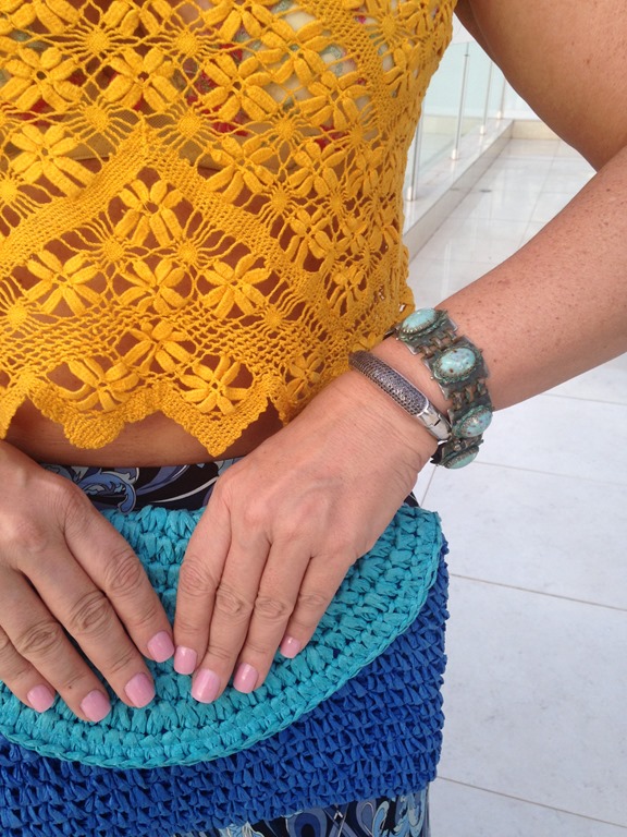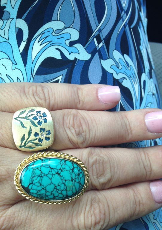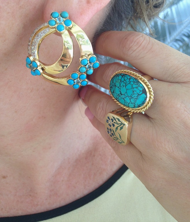 Turquesas também, mas em outra combinação de jóias, mantendo-se a base azul/amarelo