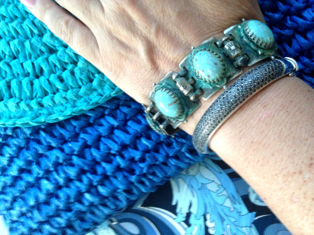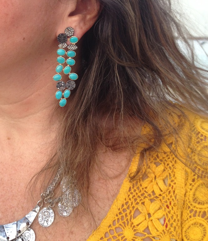 Brinco lindo de turquesas e brilhantes negros e brown + brcelete de brilhantes negros + pulseira de prata antiga e colar bijuzão étnico.