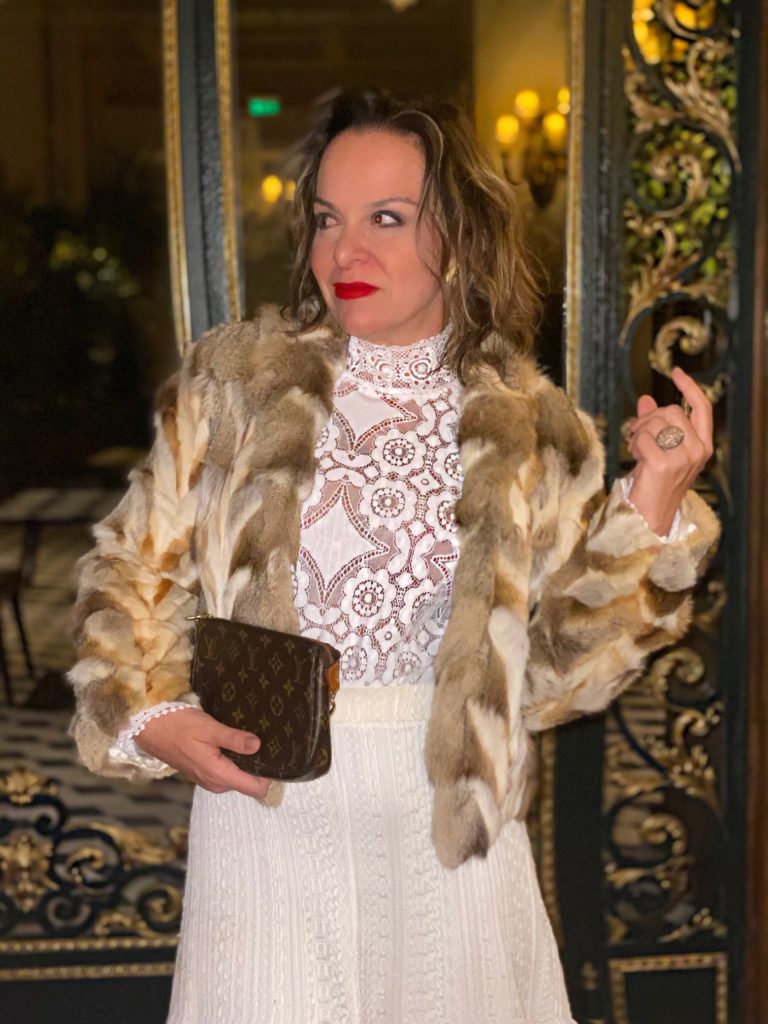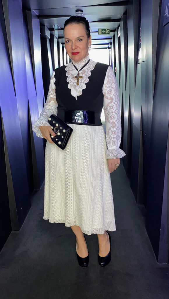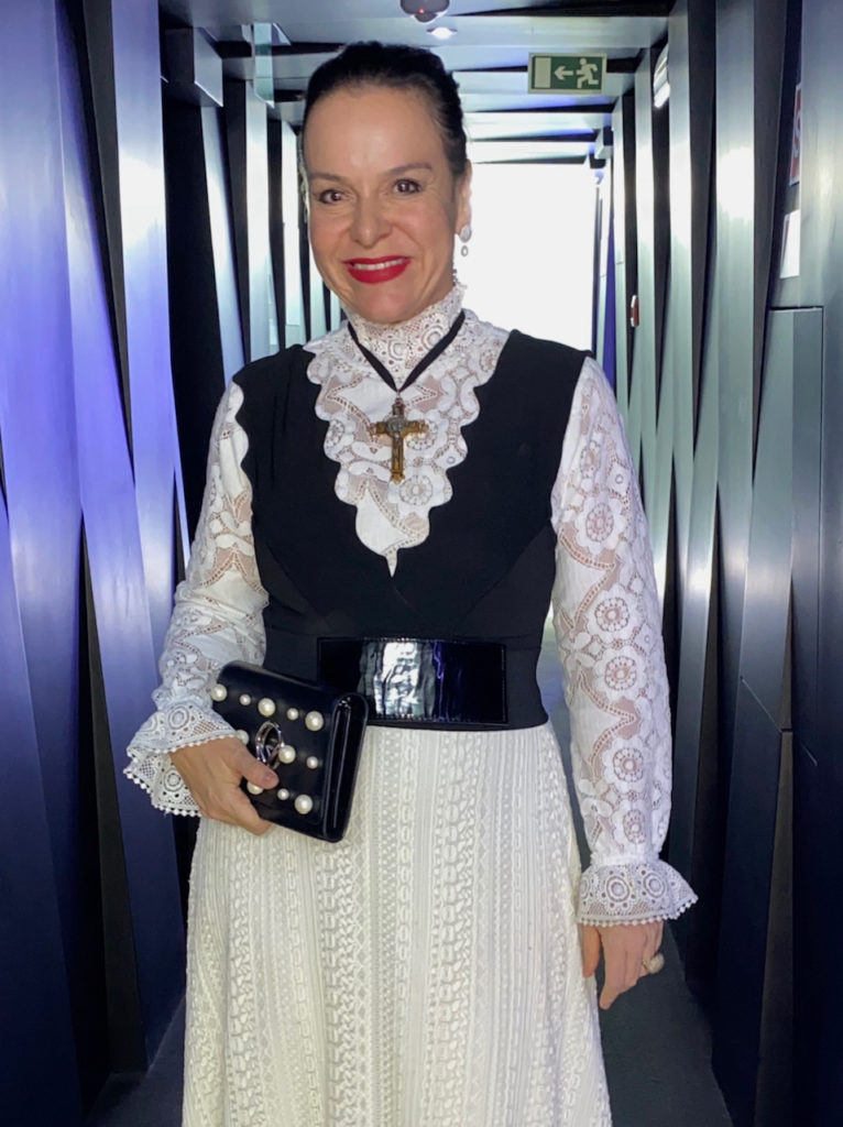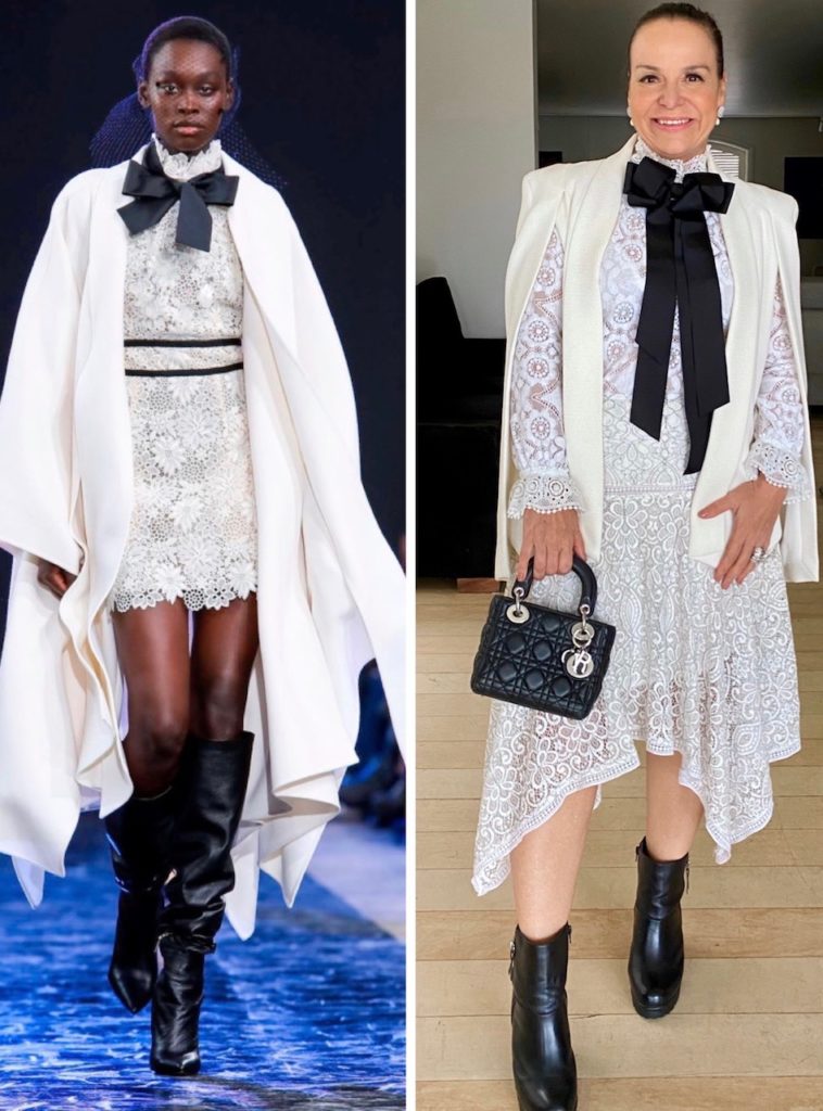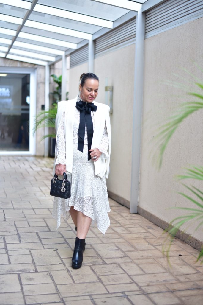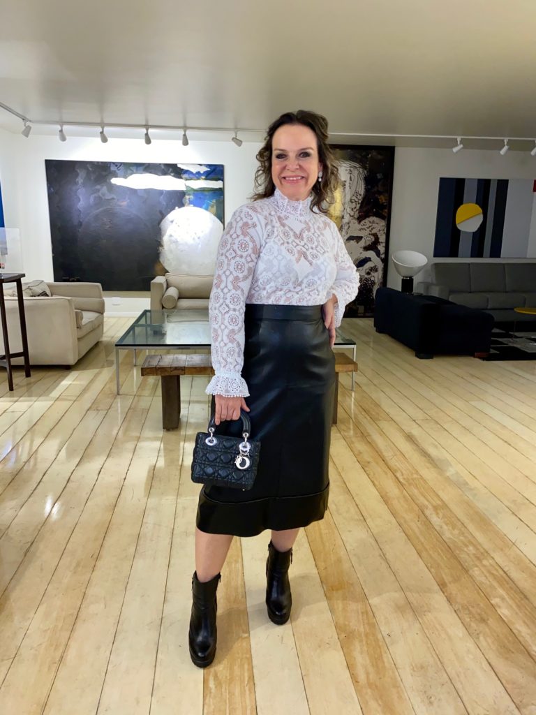 A princípio, repare que os complementos – ankle boot e mini-bag – foram os mesmos em ambos os looks, um com saia de couro e outro com saia de renda.
