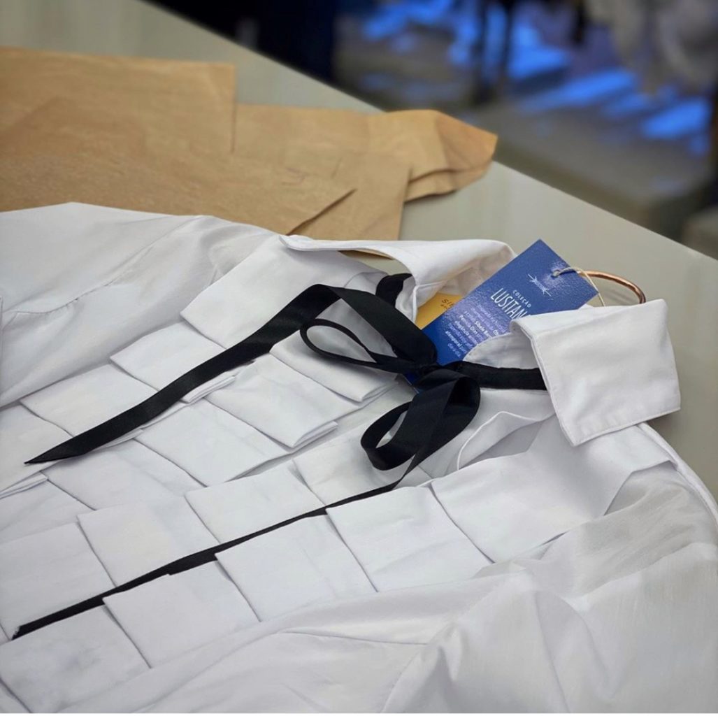 Esse foi o nome que demos então a essa CAMISA ISABEL , uma peça aristocrática, atemporal e extremamente elegante e feminina. O laço é removível permite usá-la com ou sem, e a camisa vem com uma laço à sua escolha : esse azul PANTONE 2020 ou em preto.