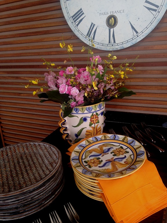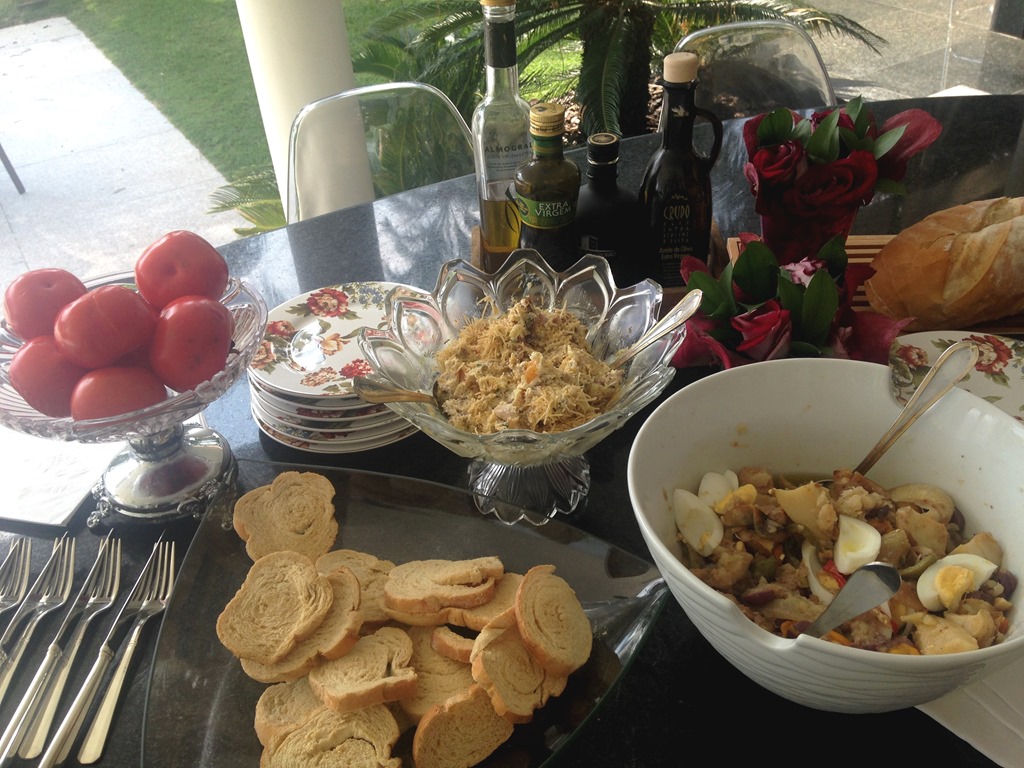 Para receber lá fora em almoço de domingo, tenho uma fórmula super prática que funciona muito bem aqui em casa: entradas frias ( nesse dia uma salada de bacalhau e um salpicão de frango ao curry – E SÓ !) e um prato único servido no aparador, bem à vontade mesmo. Coisa simples e eficiente , pois adoooro conversar e tenho apenas uma funcionária fixa no domingo.