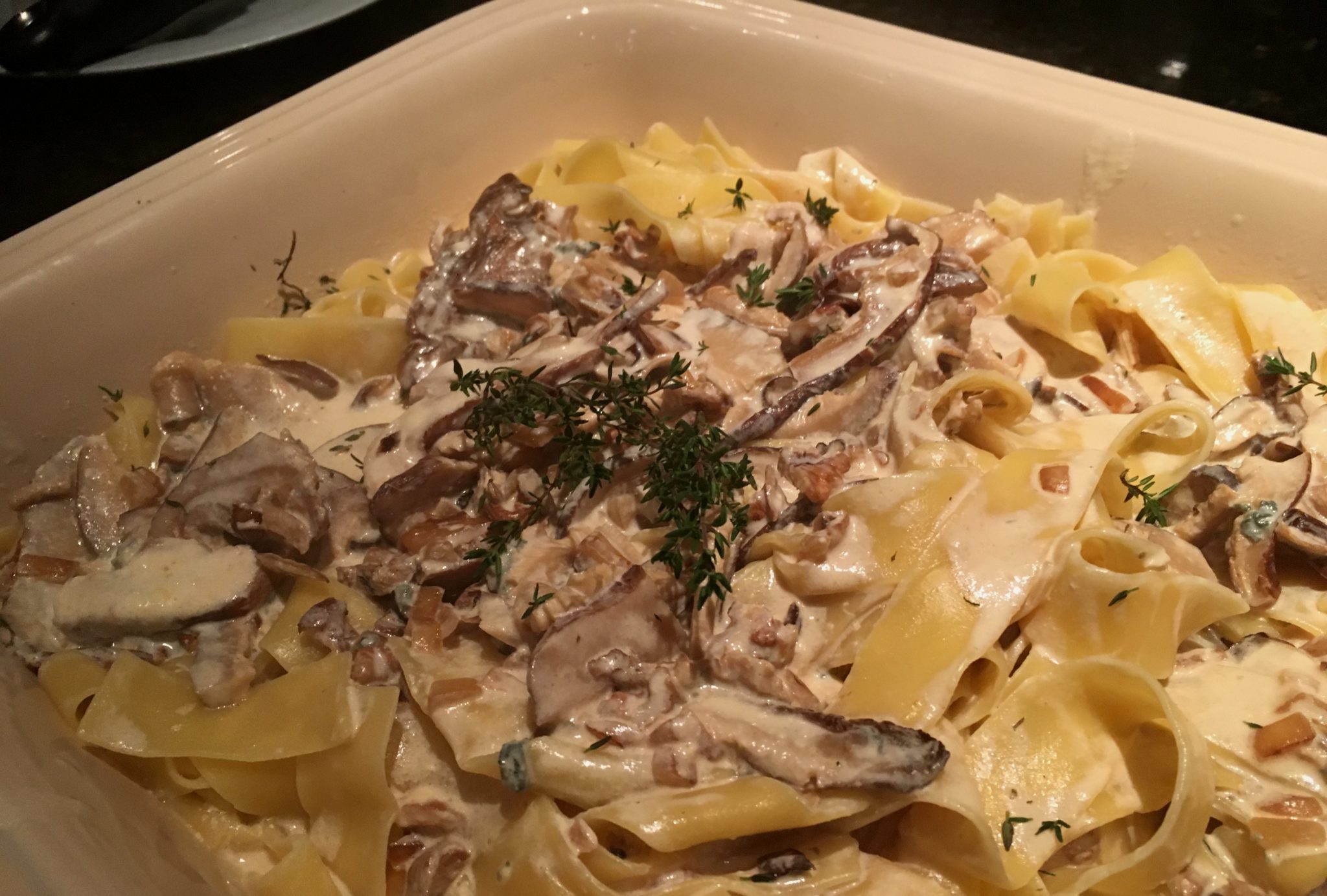 INGREDIENTES: 500 G de pappardelle ; 2 colheres(sopa) de manteiga; 1 cebola picada; 600g de filé mignon em tiras grossas ( ou 4 medalhões de 150g cada ); 200g de queijo gorgonzola picado; 500ml de creme de leite fresco; 1/2 xícara(chá) de nozes picadas; 50g de shitake seco hidratado em água morna por 30 minutos;  folhas de tomilho, sal e pimenta-do-reino;