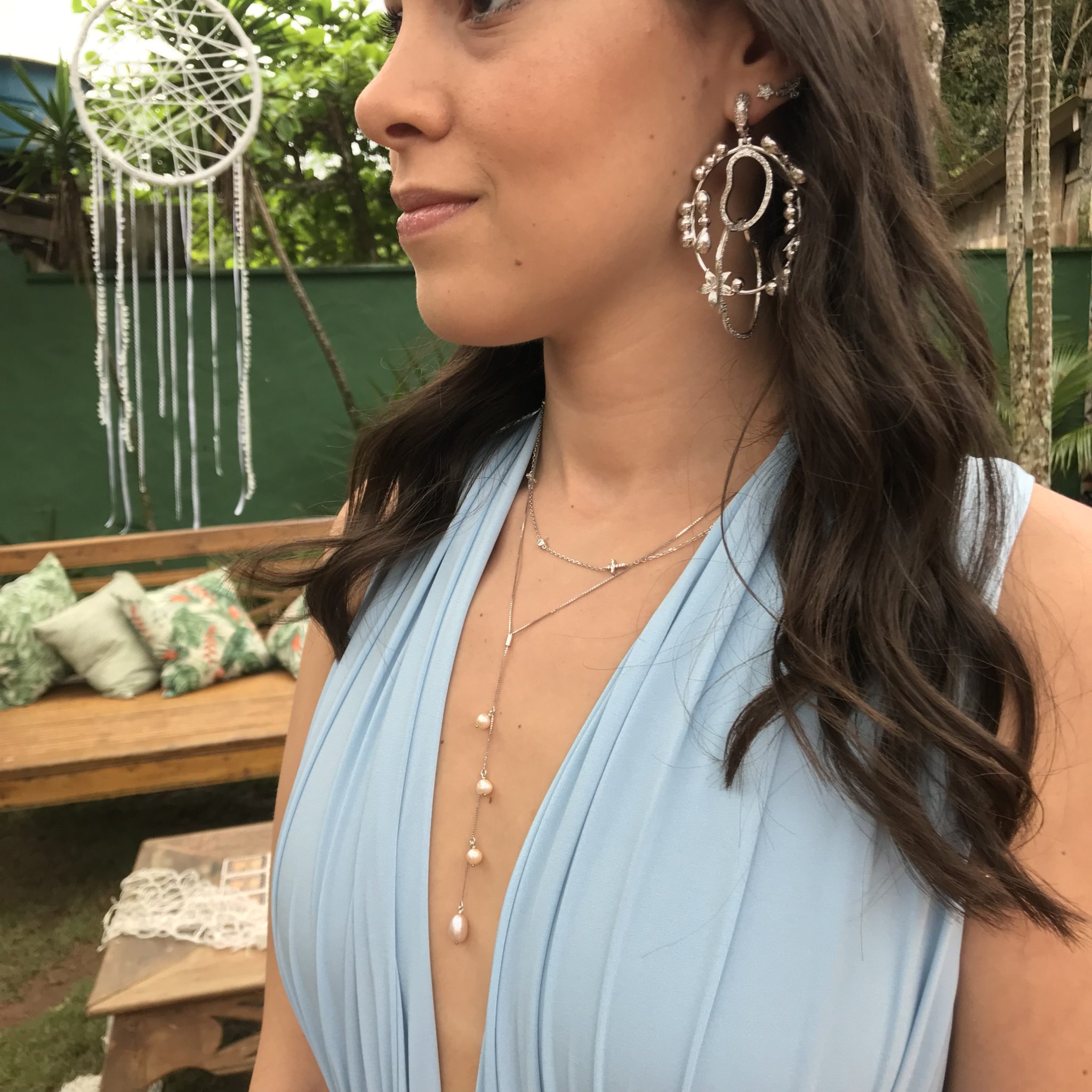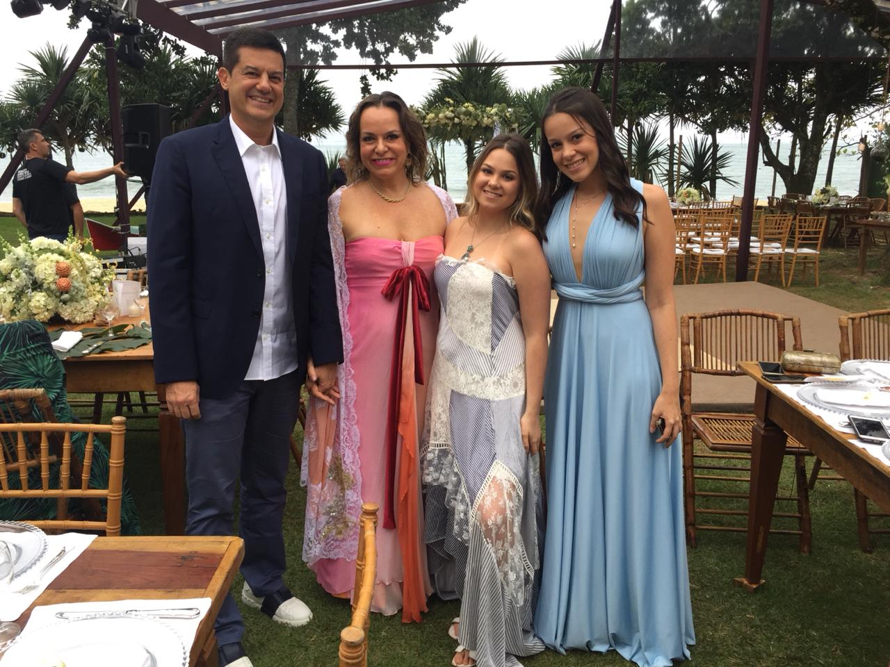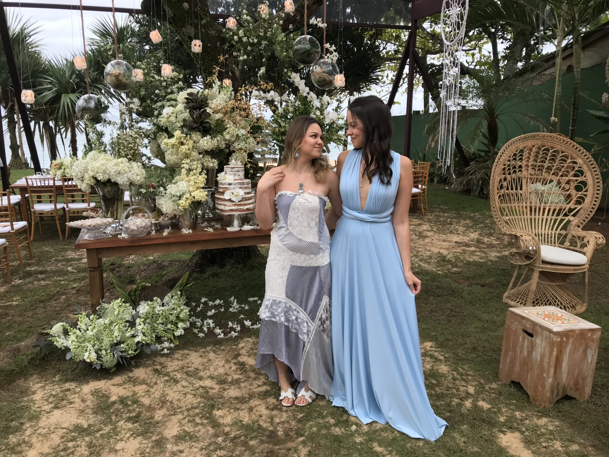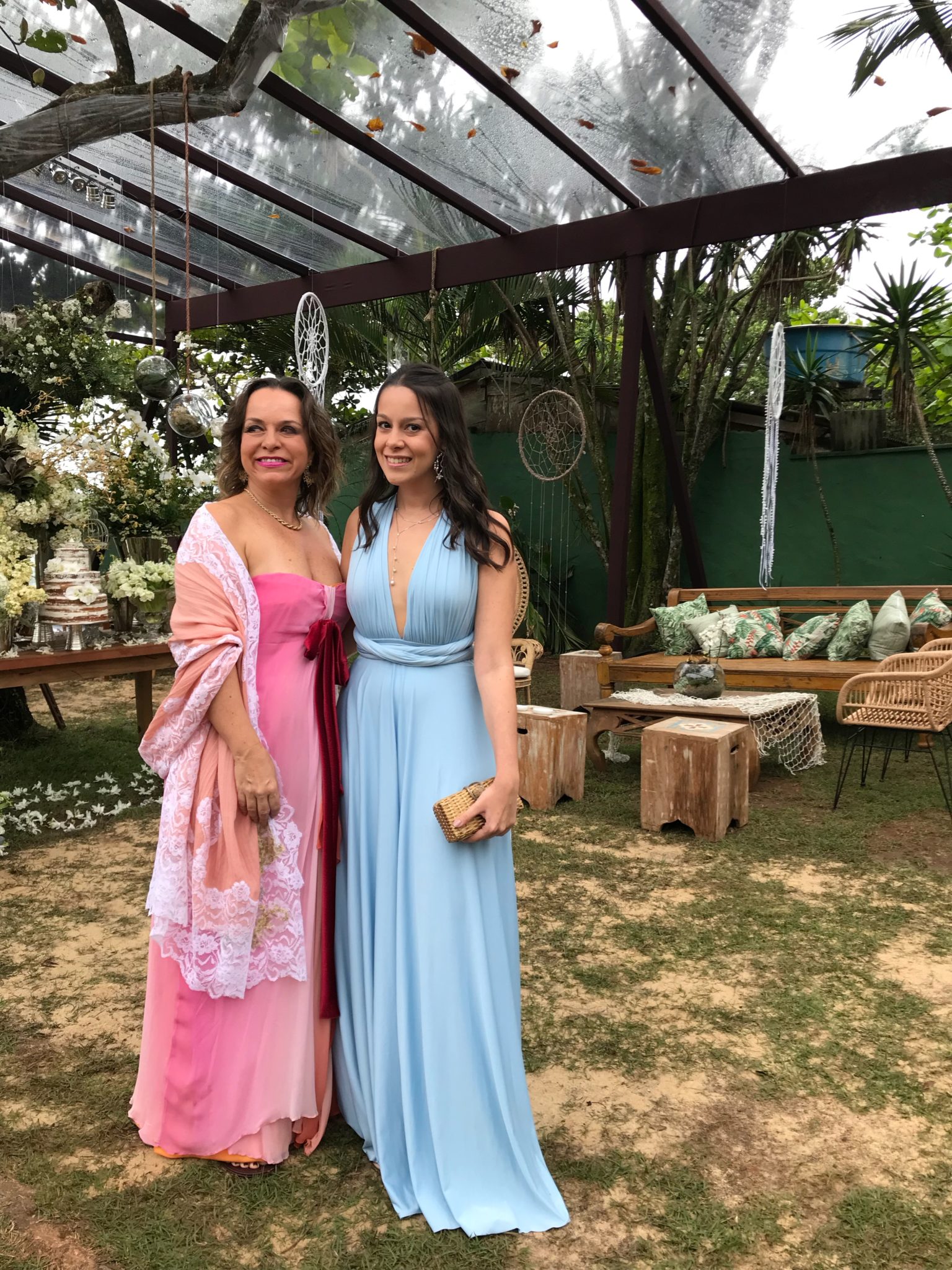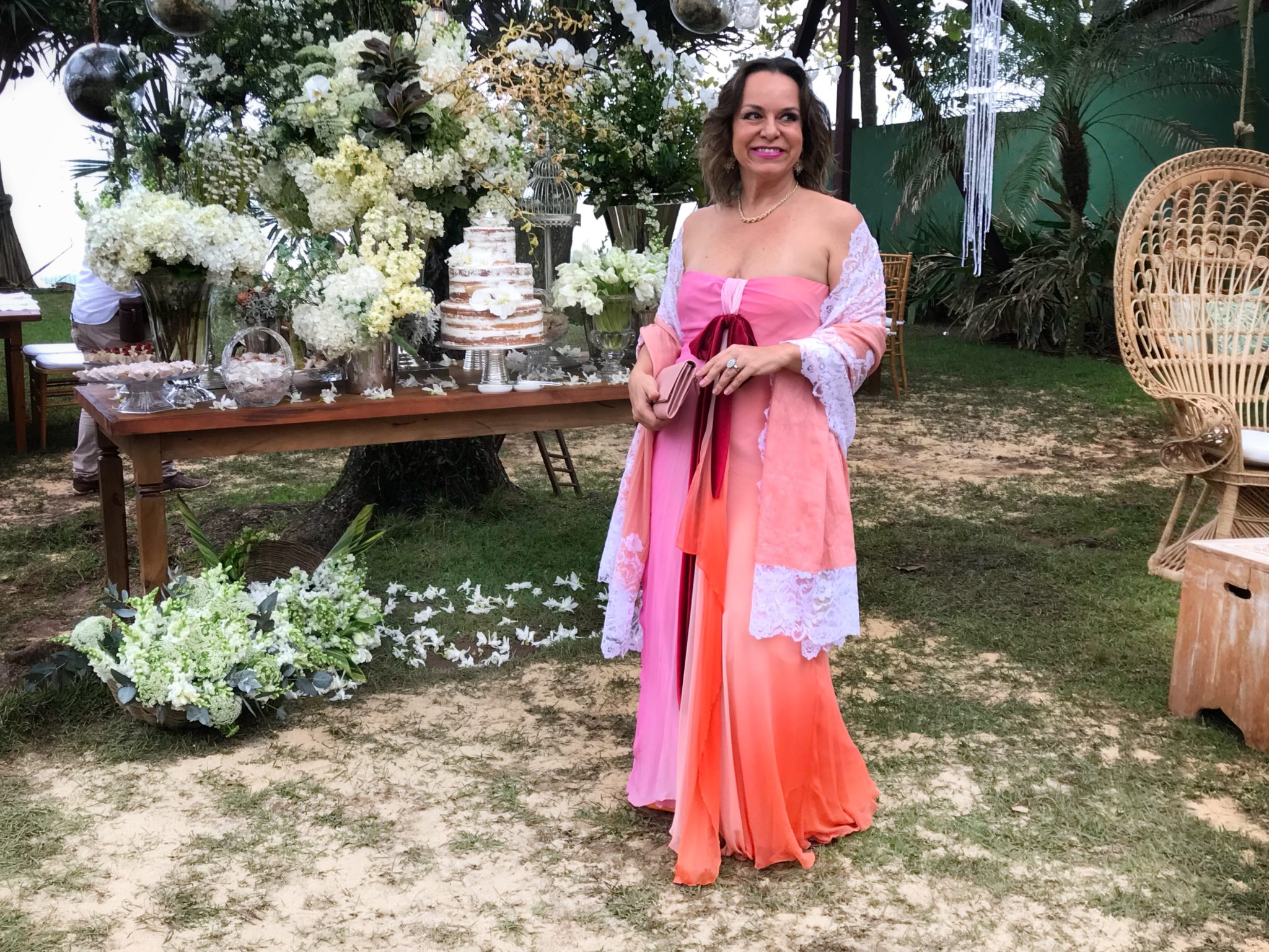 Dessa vez, o cenário era a praia de Maresias, no litoral norte de São Paulo. O convite pedia roupas claras e pouca formalidade. Optei por um longo tie-dye fluido em tons de rosa e rasteira, mesmo sendo madrinha.