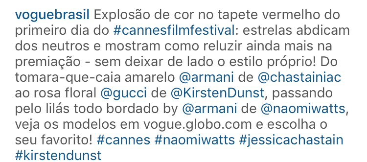 Uma boa opção são os lindos looks que desfilaram no Red Carpet de Cannes . Aliás esse é um dos eventos mais esperados do ano, onde as atrizes aparecem mais lindamente vestidas. Nesse ano não foi diferente: cores suaves, estampas florais , uma super inspiração para um casamento de tarde, na praia ou no campo!