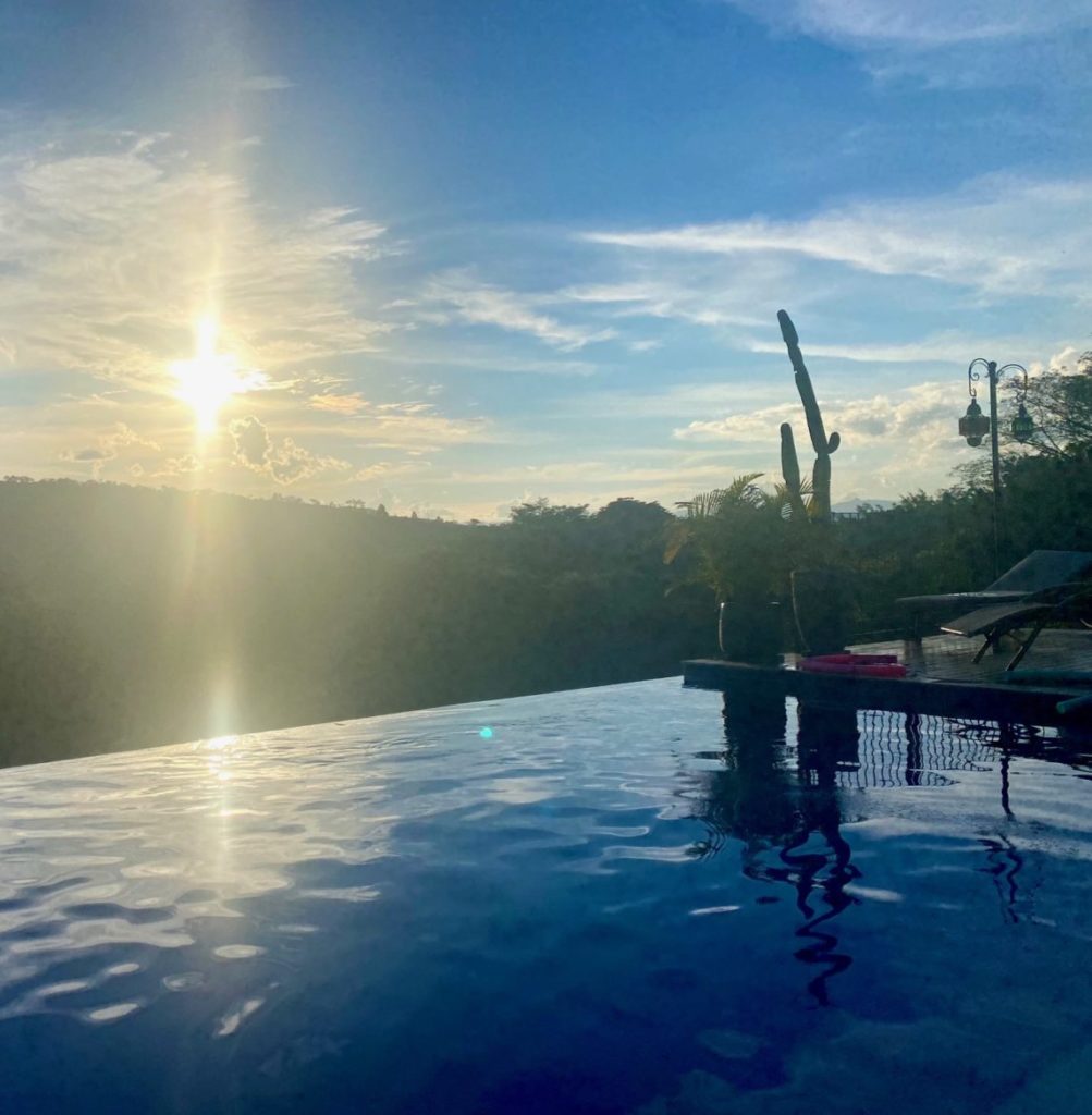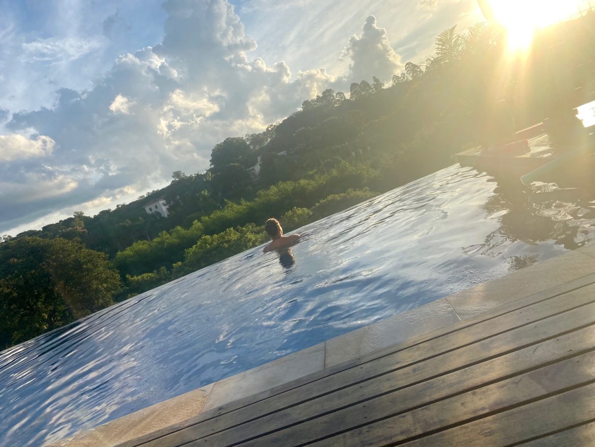 A piscina é um show à parte, lindamente plantada no alto de uma colina, com borda infinita de cara para essa vista. Deliciosa durante o dia ou ao por-do-sol por ser aquecida, é mais um projeto feliz da arquiteta ouropretana TATI TRÓPIA .