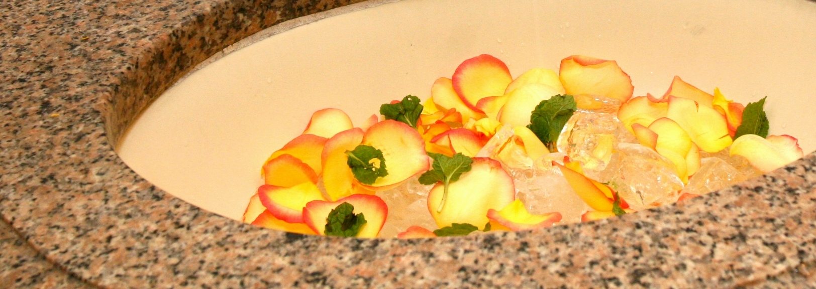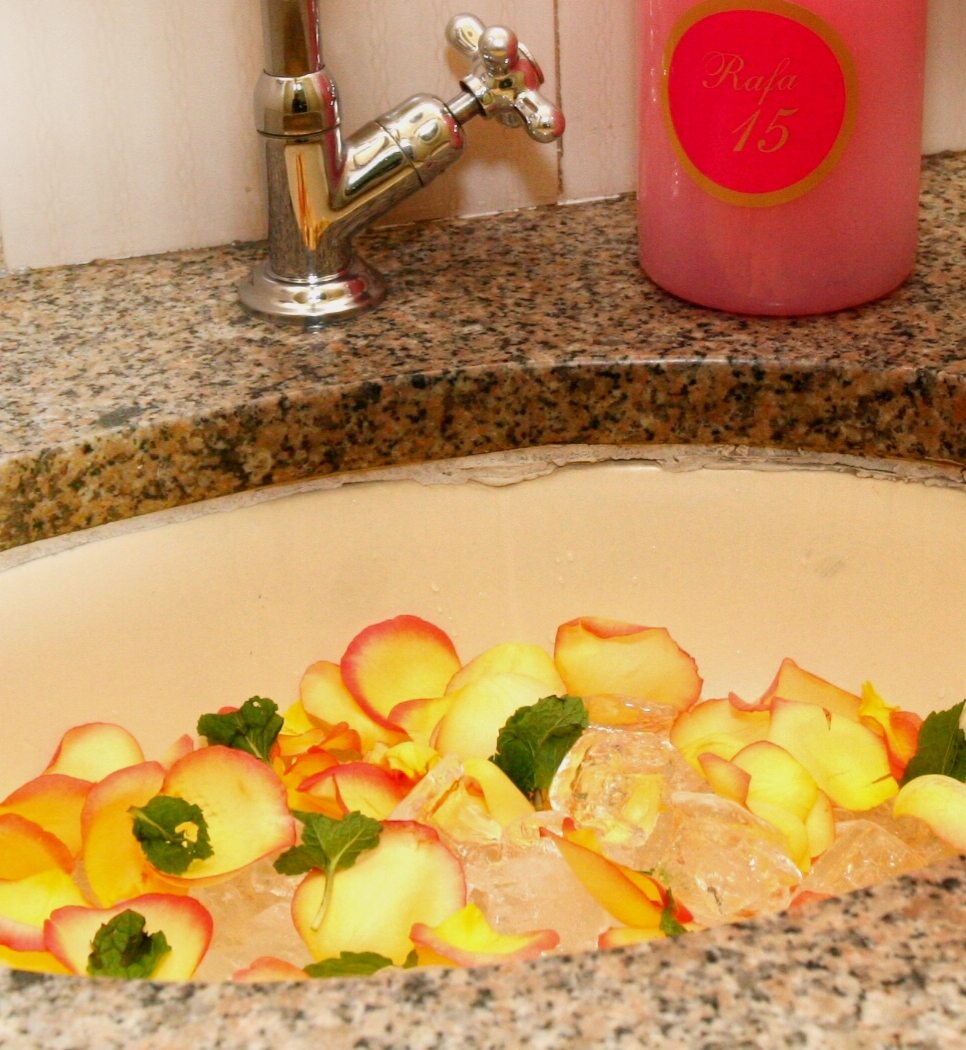 Ela fez um leito de seixo rolado branco. Eu já tinha feito algo assim na festa de 15 da Rafa em 2010, porém com gelo, pétalas, folhas de hortelã e gotinhas de essência de hortelã. Um charminho a mais, que chama a atenção e acaba que nunca mais fiz.. Ficou mais essa idéia para o almoço da mamãe – em uma 3a. versão do mesmo assunto!