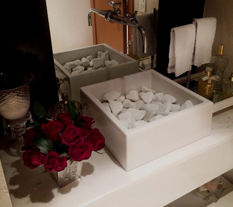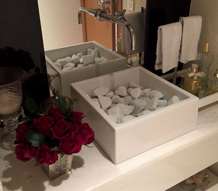 Daí tirei 2 idéias para um almoço que fiz nessa semana para minha mãe e que vou mostrar amanhã: escrever a ordem no quadro ( já tenho, mas a gente esquece, né? ) e servir um capuccino de funghi em xícaras de cafezinho pela 1a. vez aqui em casa. Coisa quentinha, gostosa e que agrada muito! Outra idéia linda: incrementar a pia do lavabo: