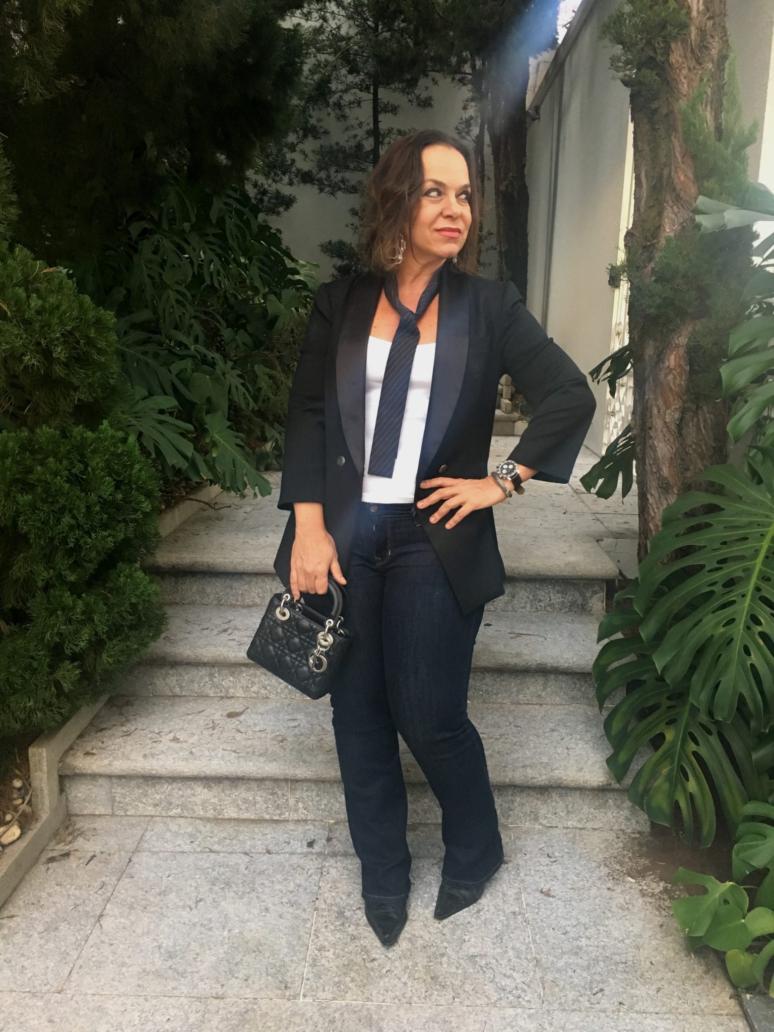 Eu optei por uma pegada moderninha, com uma gravata displicente em cima de uma camiseta de malha. As mesmas joias do look de 6a. seguiram para o look de sábado. Assim, eu tento a mostrar a versatilidade de uma joia contemporânea, aquela que acompanha você em todos os momentos do seu dia. (Lembrando que ambas brilhariam muito em festas também, concordam? )