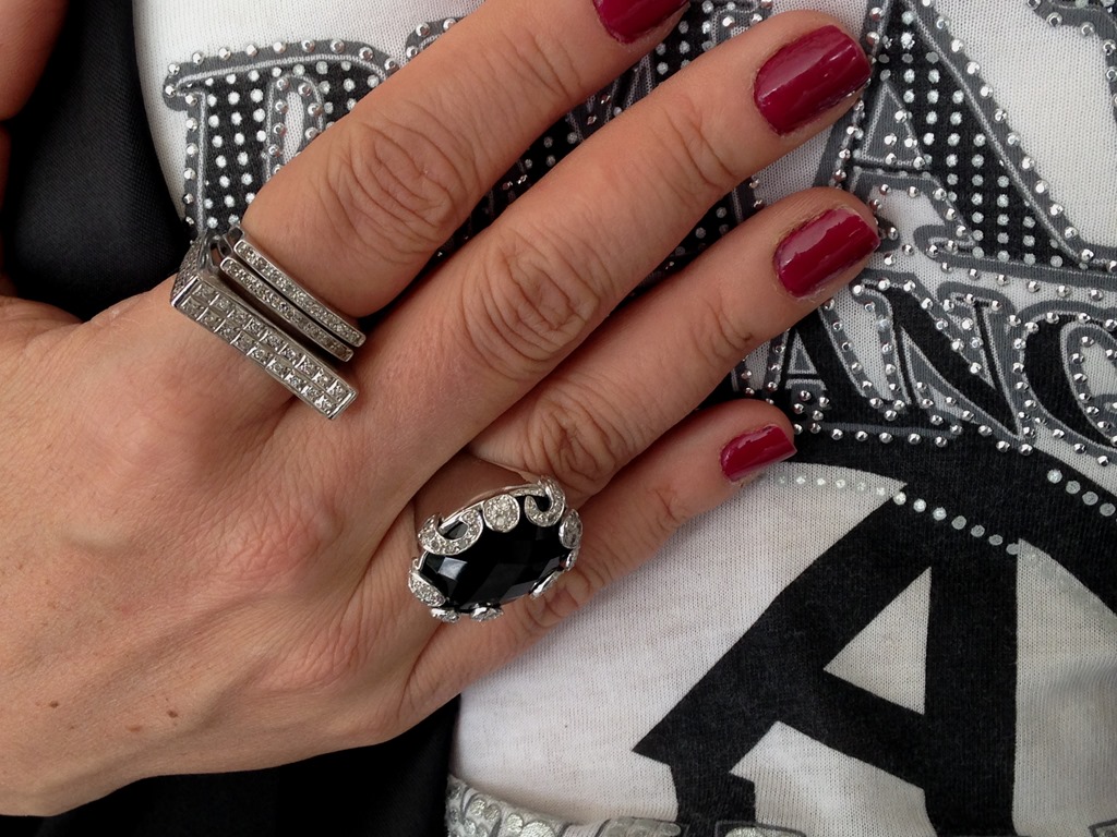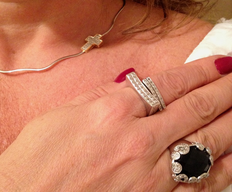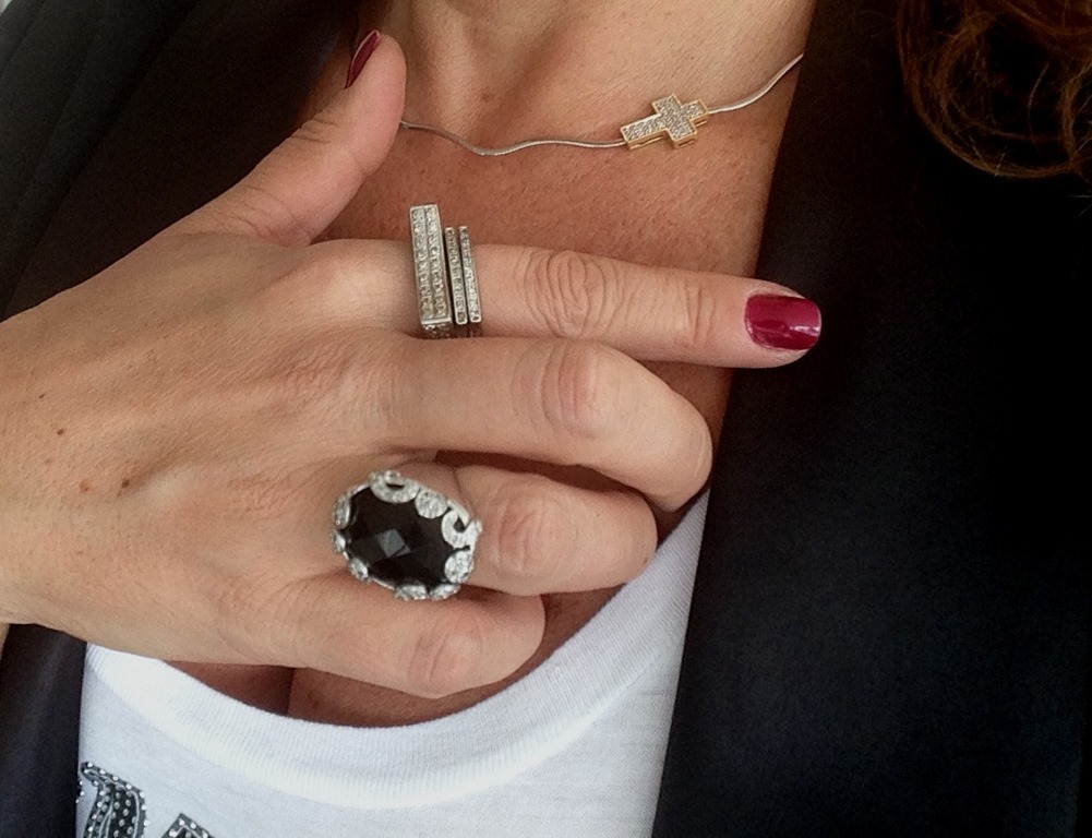 O mesmo colar cruz de brilhantes foi usado em look PB para jantar em casa de amigos.