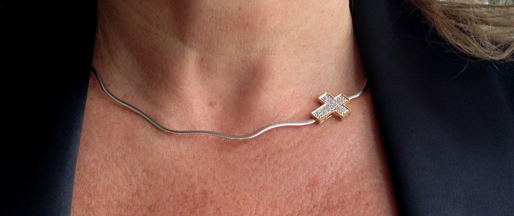 Não é um luxo? Fica bem assentado no colo, e tem o charme extra da cruz ser deslocada do centro e ficar “pousada” na lateral .