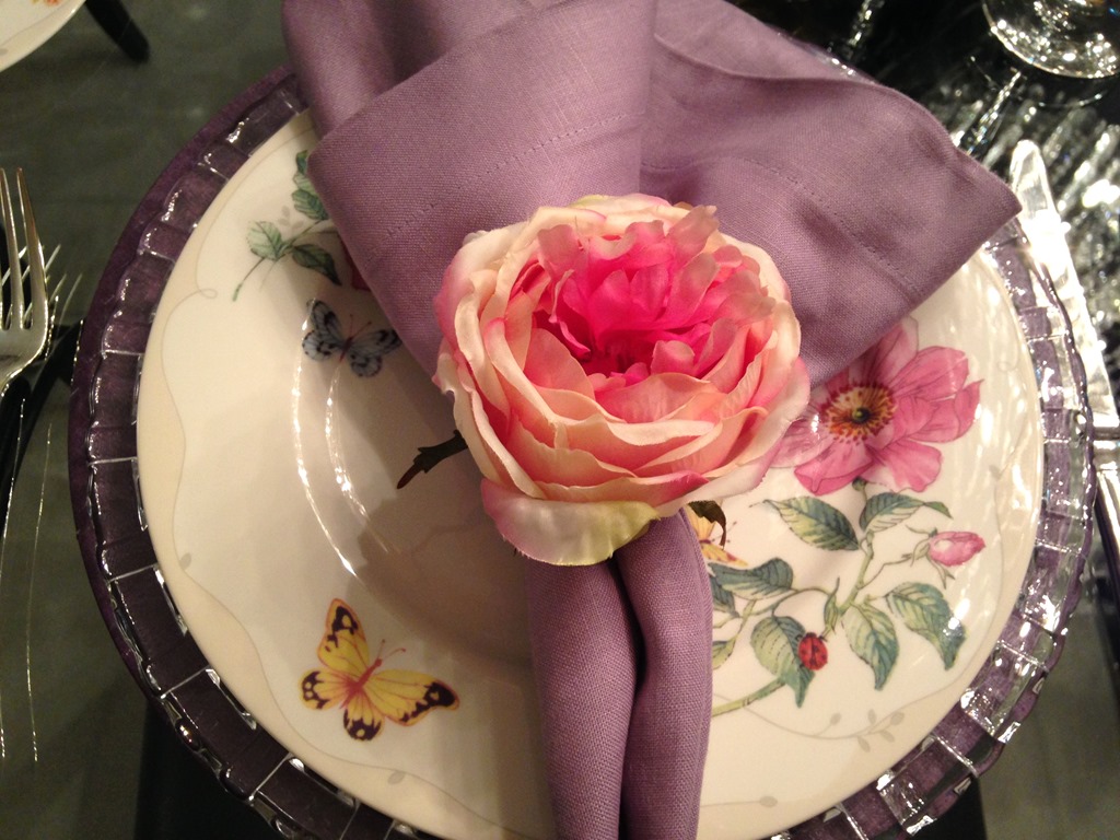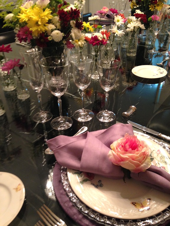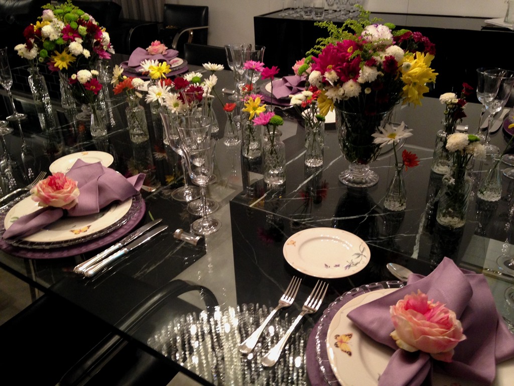 Ela misturou 2 arranjos coloridos com mini-vasinhos em profusão multiplicando essas cores todas. E manteve a delicadeza dos tons no aparelho e nos guardanapos. Lindo!