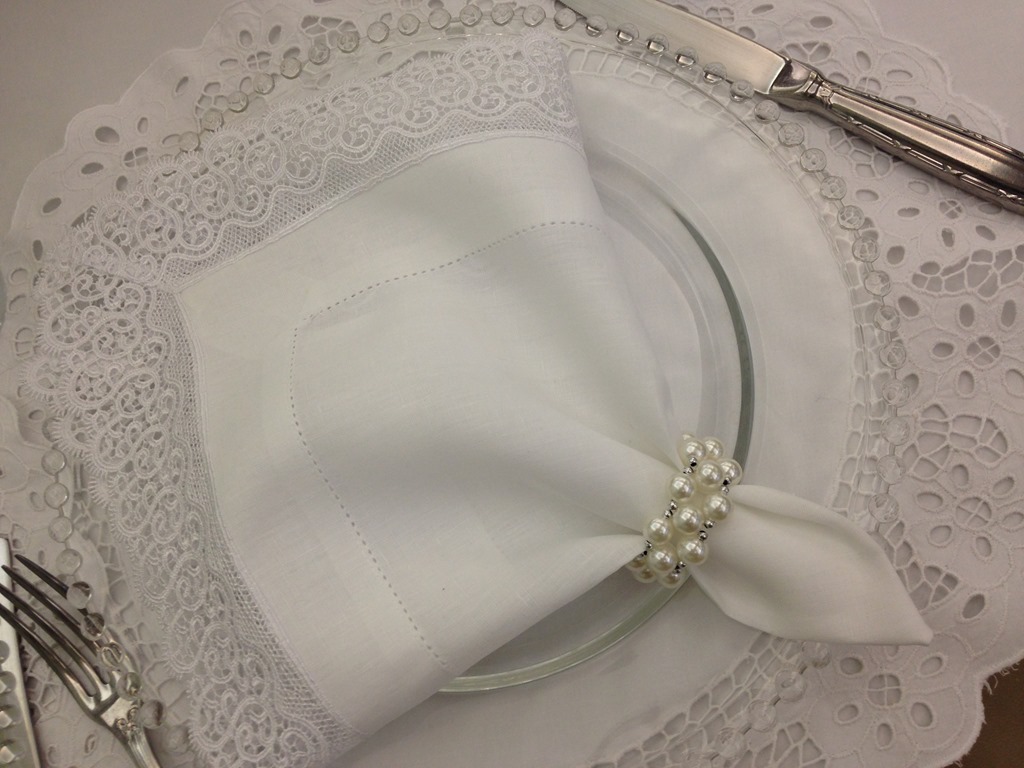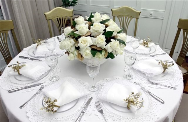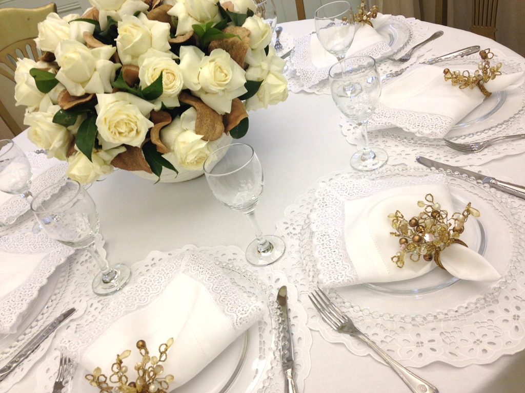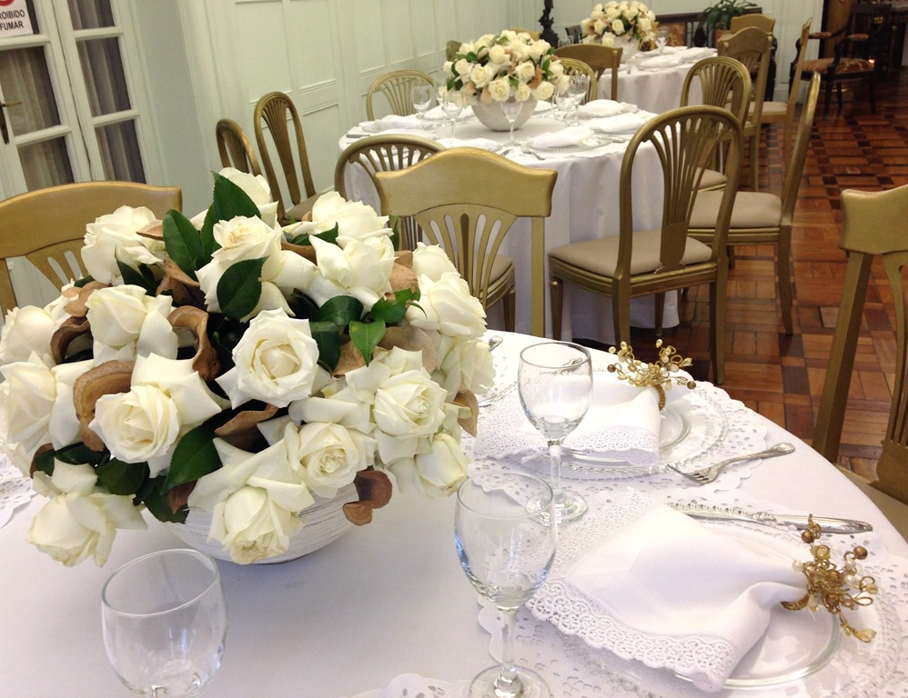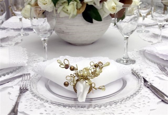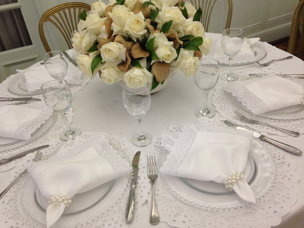A unidade das flores brancas em vasos brancos foi mantida e as mesas da BELISSIMA foram alternadas com porta-guardanapos dourados e porta-guardanapos de pérolas, dando leveza e requinte em um decor de alma bem feminina! Feito para moças de fino trato, by the way! rsrs ![]()