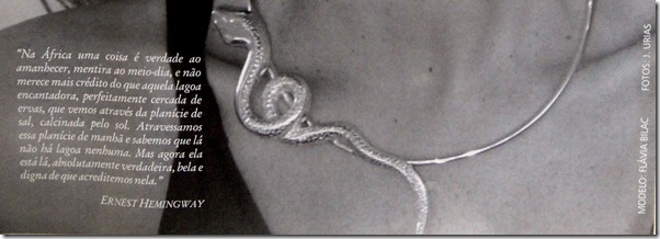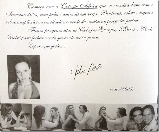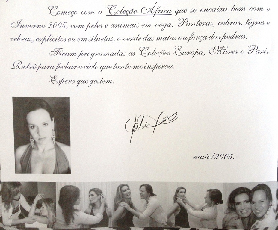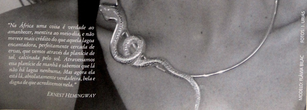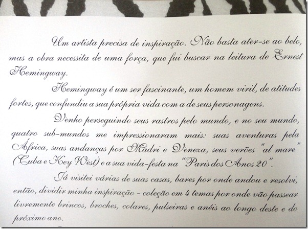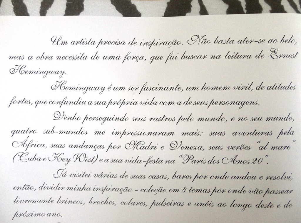Em 2005,iniciei uma série de 4 catálogos de coleções inspiradas na vida e obra de Hemingway, pois estava lendo tudo dele na época. As 4 coleções foram inspiradas nos locais onde ele viveu suas aventuras.Tive o prazer de visitar quase todos : África e Cortina d´Ampezzo ficaram faltando , apenas .