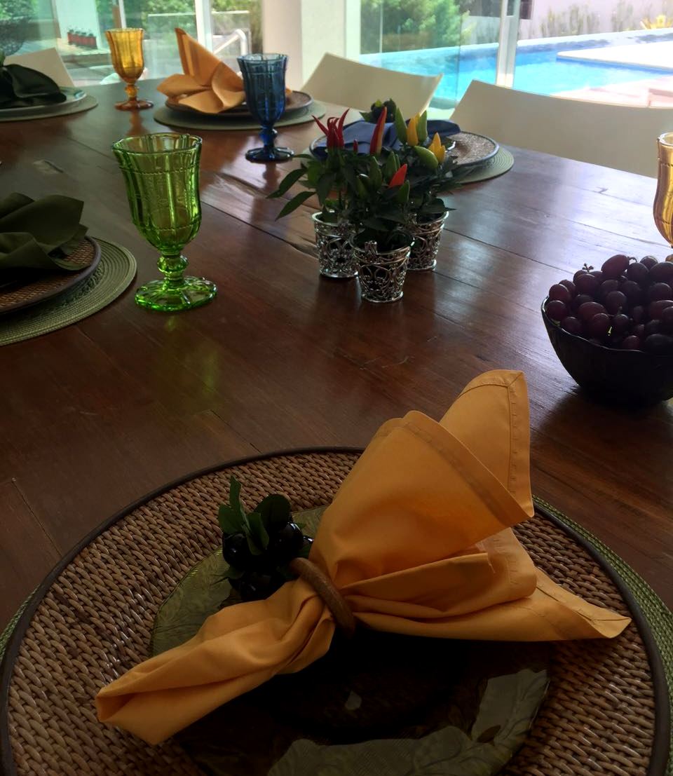 Ela usou elementos coloridos e fez essa linda mesa em sua casa de campo.