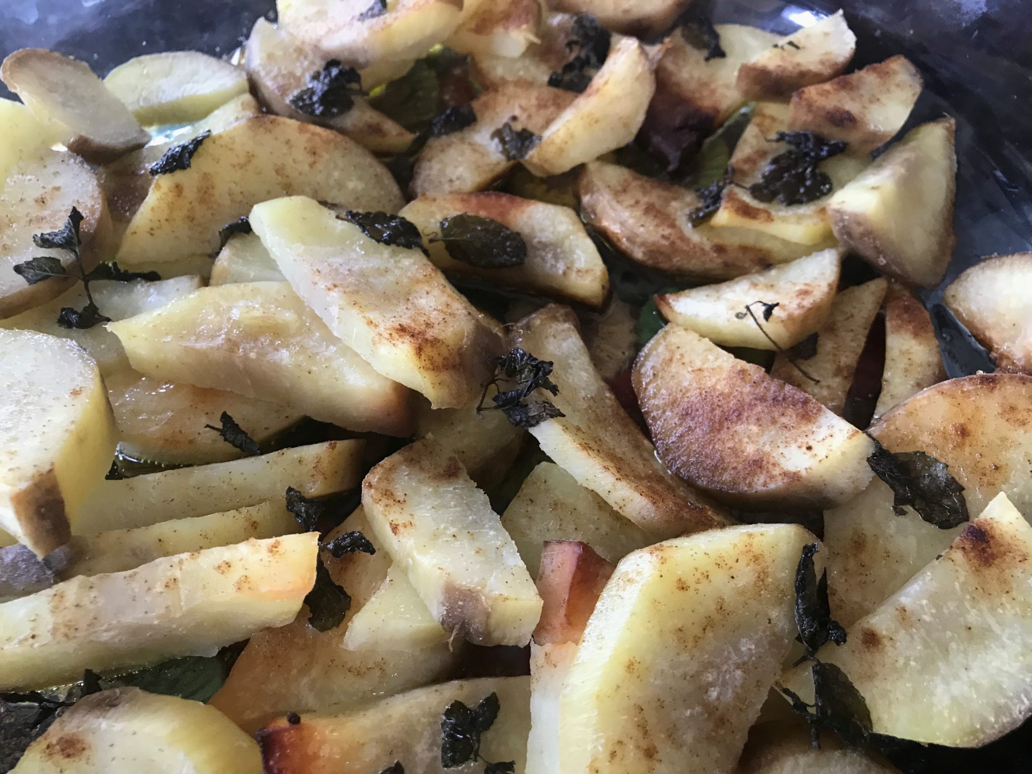 PREPARO: Depois de cozidas, escorra as batatas e corte-as em palitos generosos com a casca. Coloque em um refratário, borrife com azeite, coloque pimenta-do-reino, sal, hortelã e páprica.Asse em forno pré-aquecido em 180 graus até ficarem bem coradas.