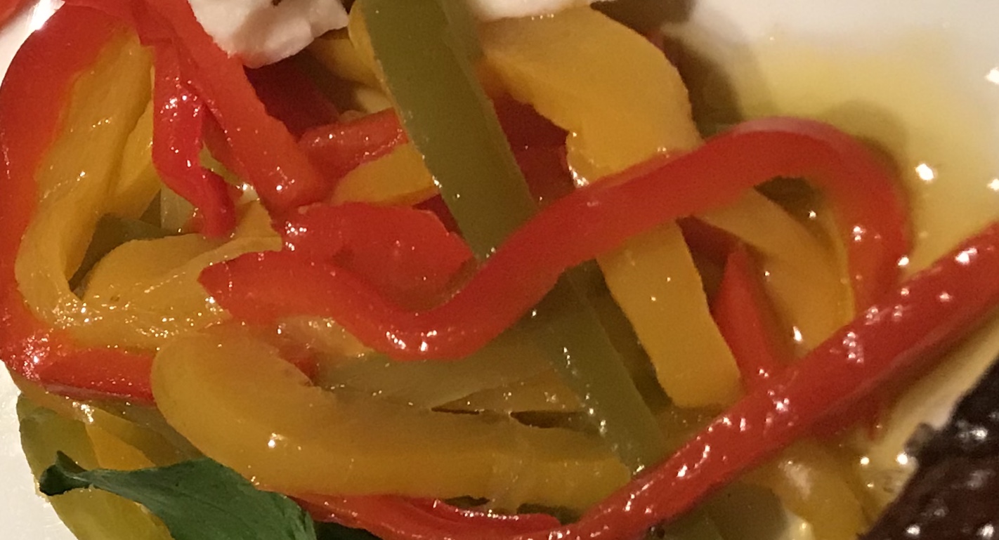 INGREDIENTES: 6 pimentões vermelhos; 6 pimentões verdes; 6 pimentões amarelos; 10 dentes de alho inteiros descascados; 500 ml de azeite extravirgem; sal, manjericão e pimenta-do-reino em grãos