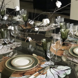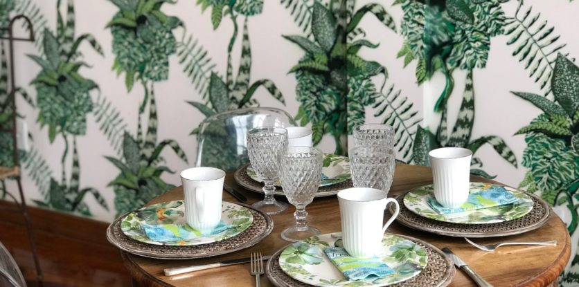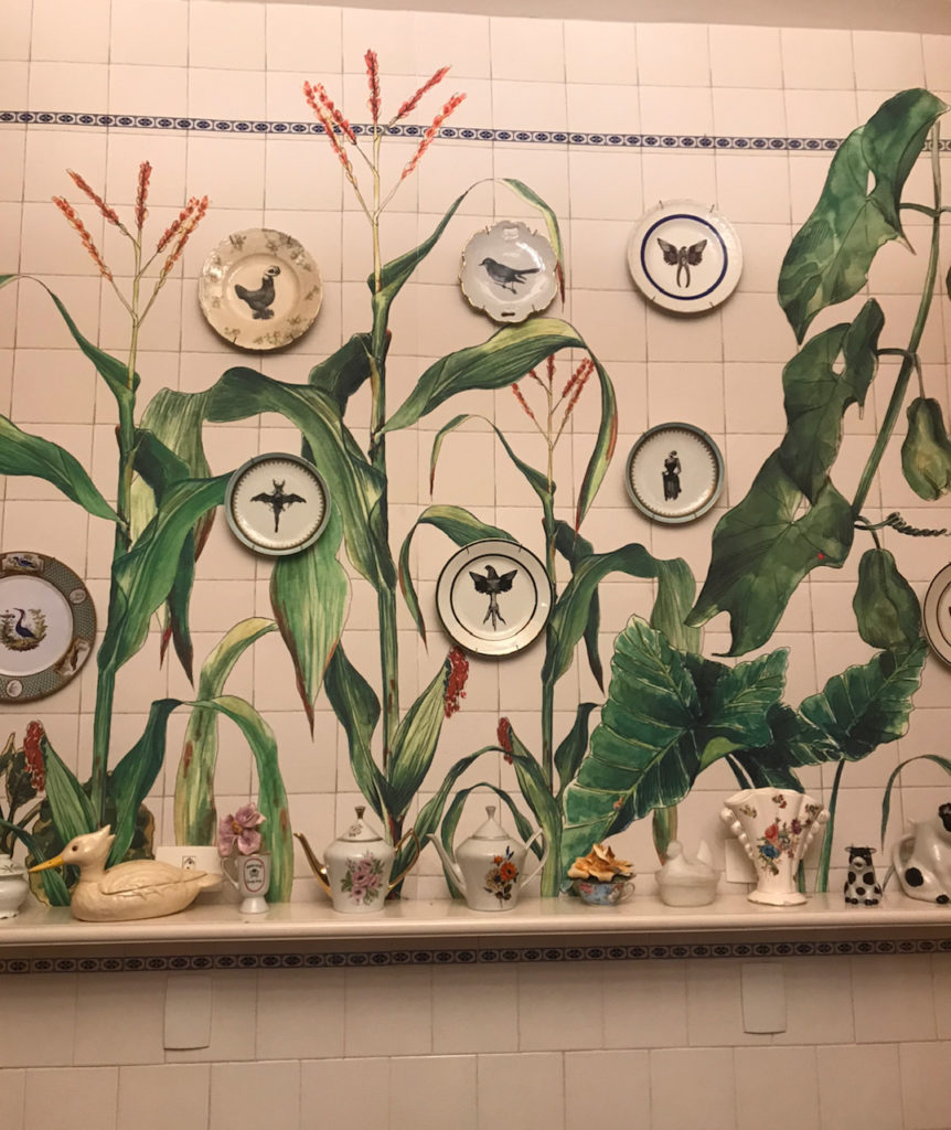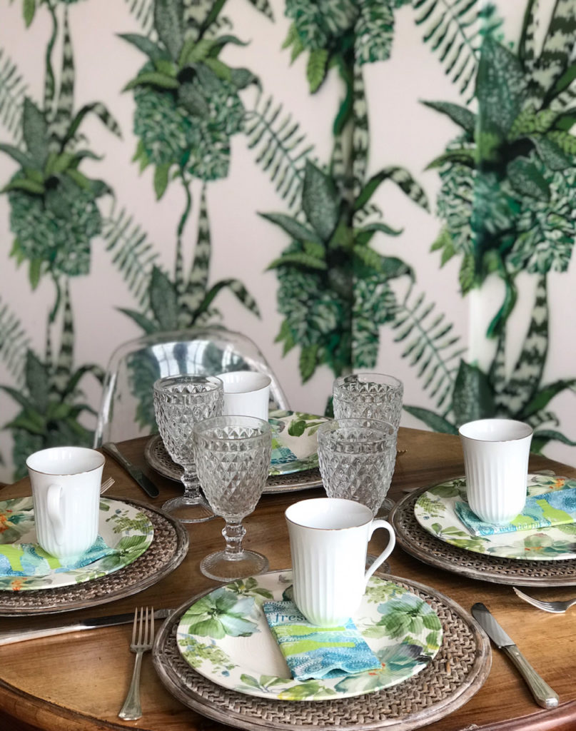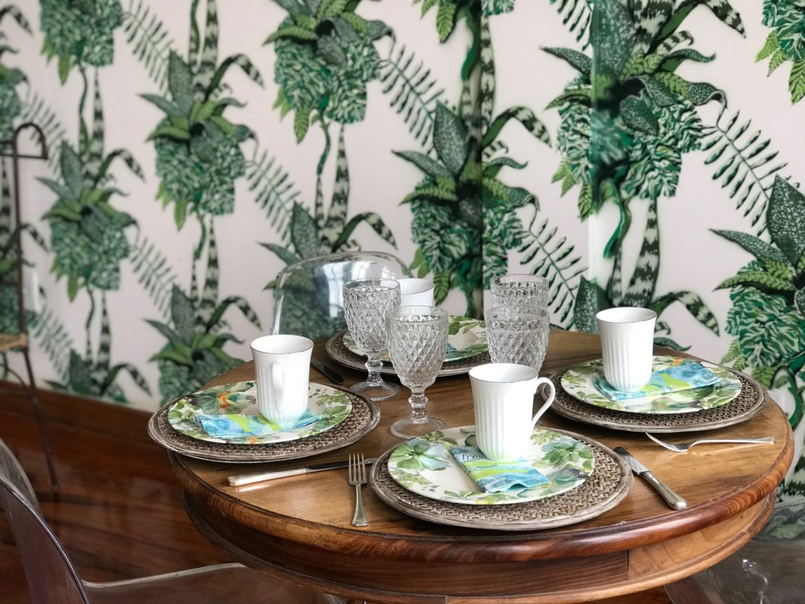 Repare no detalhe da louça também em folhas, como se a pessoa que me deu esse presente já soubesse dessa parede que estava por vir!