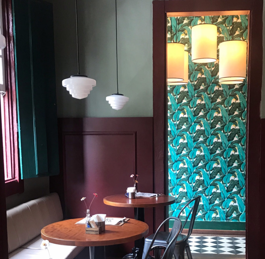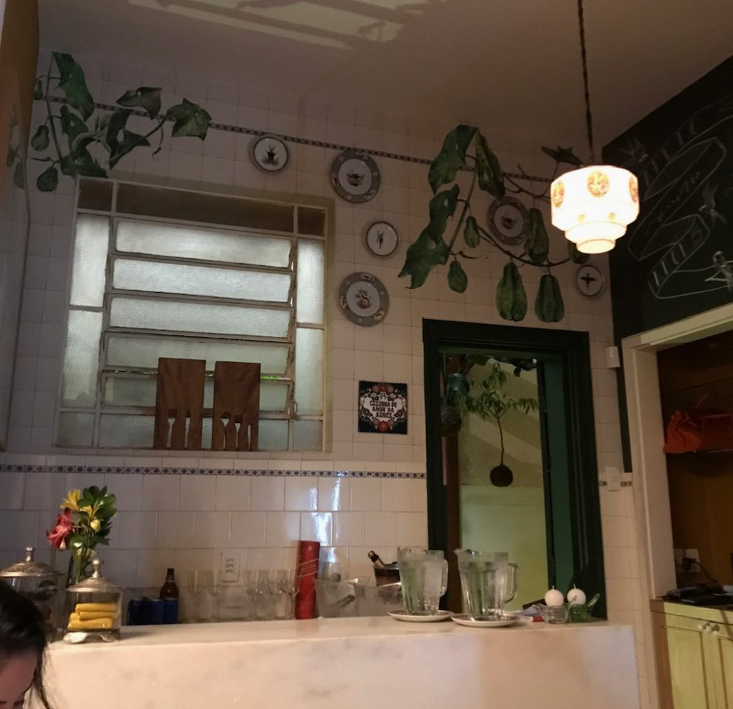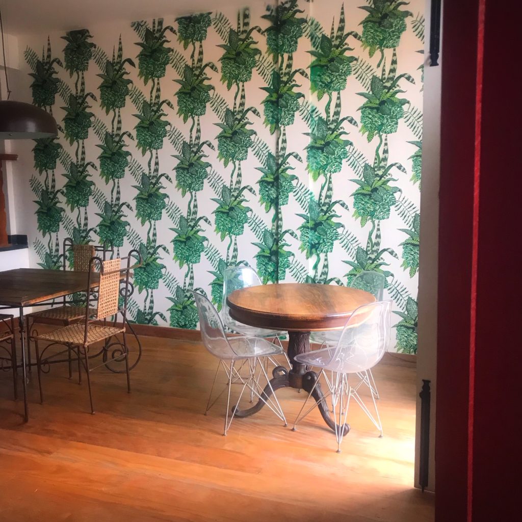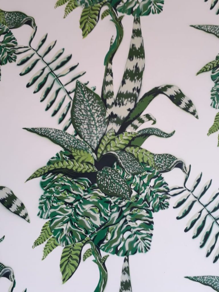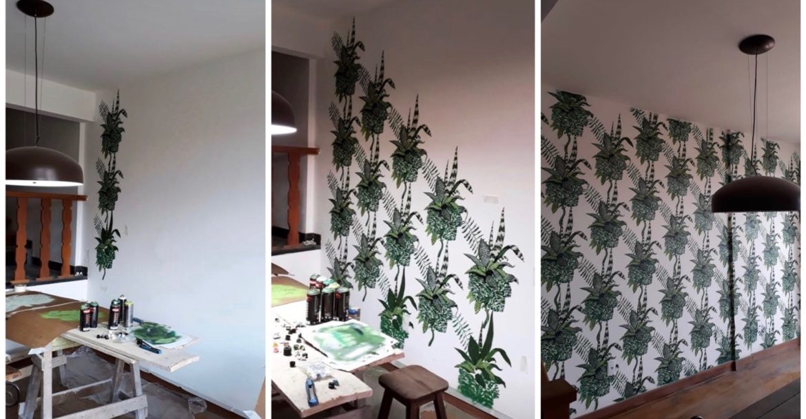 Essa parede de folhas chamou muito a minha atenção e me fez querer saber de onde era o “papel de parede”. Surpreendentemente soube lá mesmo que era pintura, e que o artista THIAGO TRÓPIA era de Ouro Preto. Fui atrás dele então, na certeza de que era isso o que eu queria para minha sala.