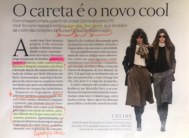 Esse artigo é de COSTANZA PASCOLATO para a VOGUE BRASIL . Ela ressalta exatamente essa alfaiataria perfeita usada com peças separadas e acessórios clássicos, como bolsas, botas e lenços.