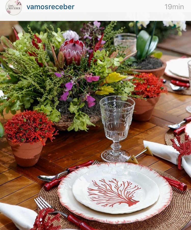 Repare nas misturas: jogo americano de palha, louça vermelha, flores coloridas, vasinhos de barro.