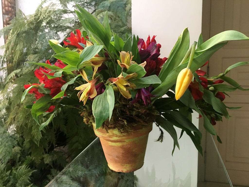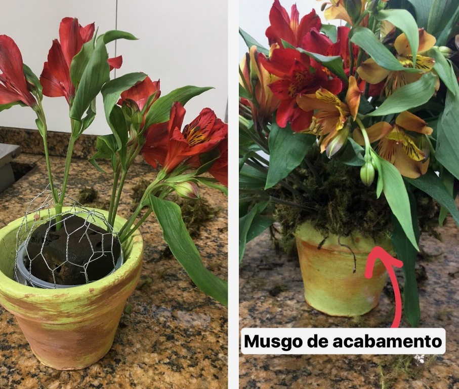 Depois de preencher o vasinho todo com harmonia de cores, tamanhos e movimento, fiz o acabamento com musgo seco, que sempre tenho em casa. Ele além de esconder o floral, tela, etc, ainda a juda a firmar “a coisa toda”.