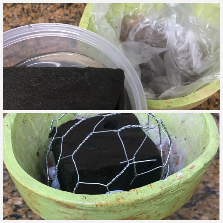 Depois do floral estar bem úmido, é hora de começar. Forrei o vasinho com plástico e coloquei o floral dentro de um potinho de plástico para evitar que a água escorresse. Completei com mais água no potinho, para garantir a duração das flores.