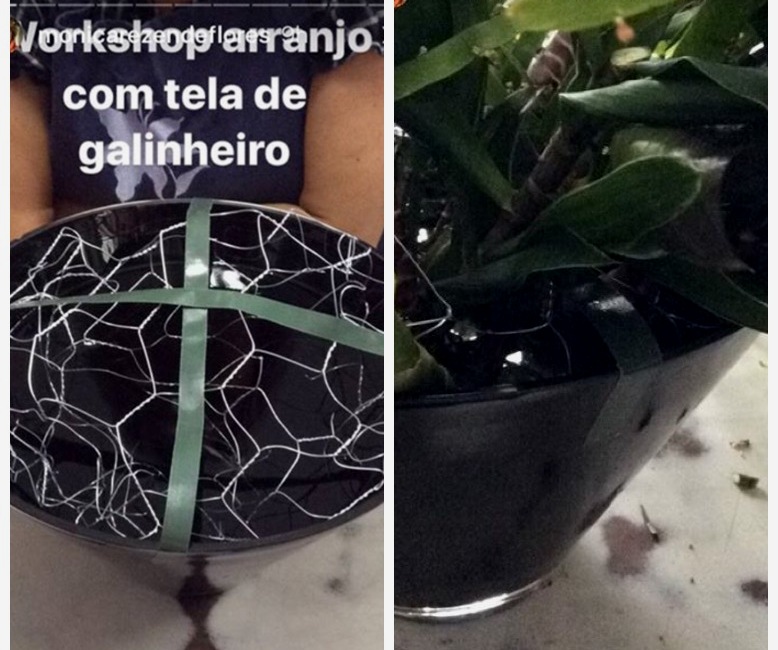 Achei interessante usar a tela de galinheiro como suporte para o arranjo. Veja como ajuda mesmo a fixar as flores e folhas!