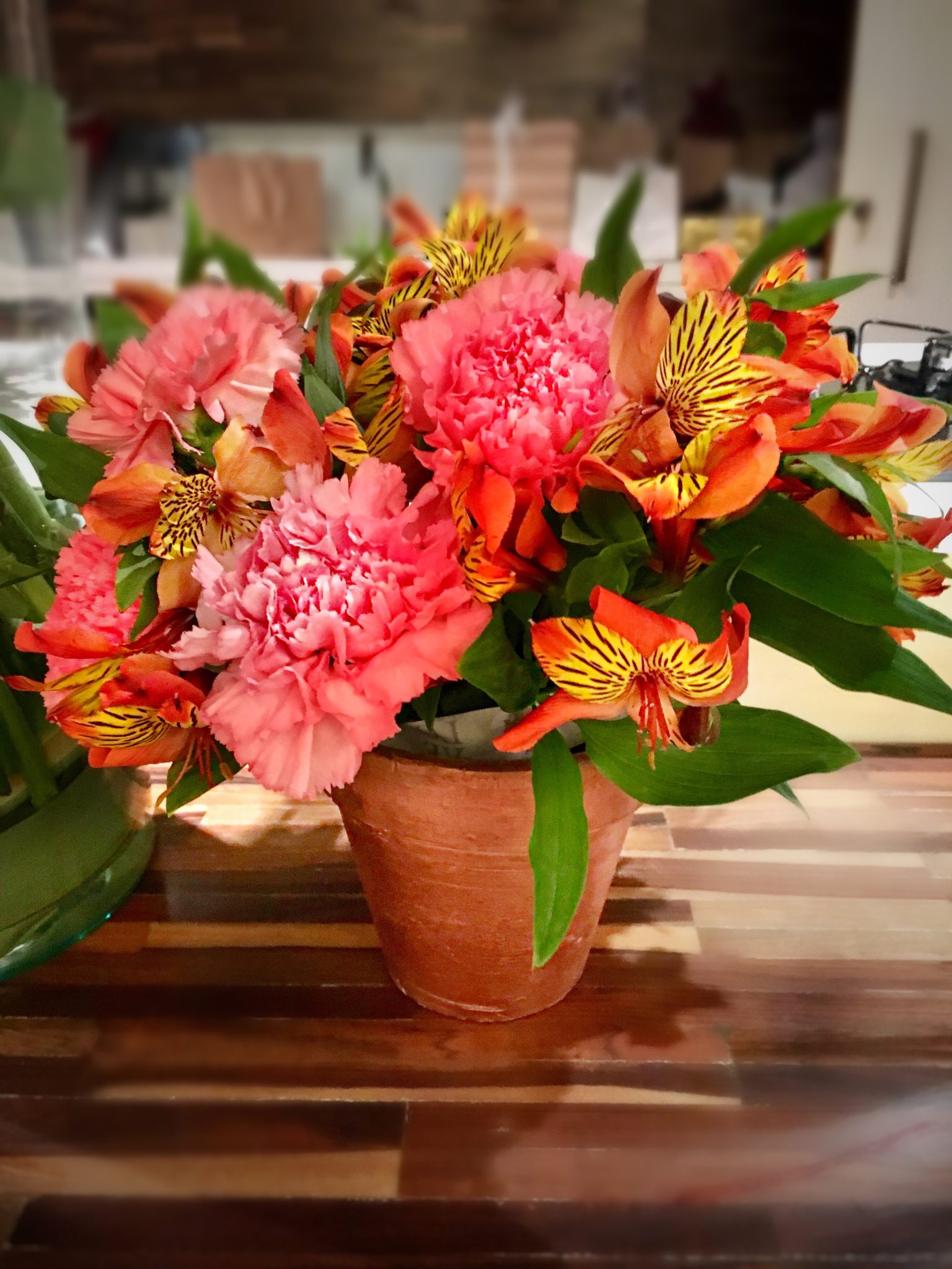 Pensei em montar esse arranjo de flores abaixo, que foi um dos que a TATI TRÓPIA ensinou a fazer. Clique no azul e depois volte aqui no post. Achei legal o vasinho simples de barro ser pintado e essa mistura de flores coloridas e folhas.
