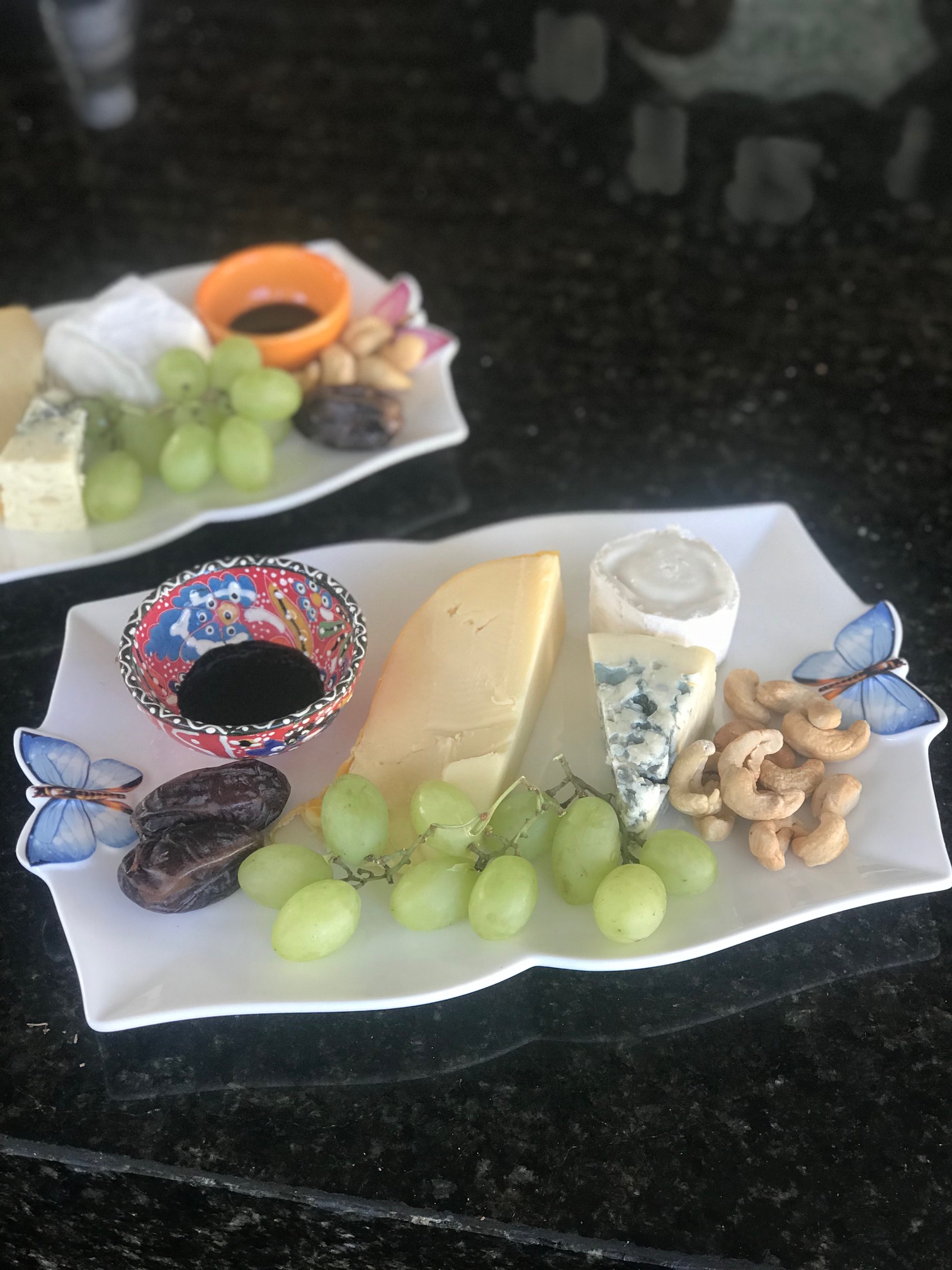 Eu sempre gosto de finalizar esses jantares em casa com um plateau de queijos e vinho do Porto. Já fica tudo preparadinho na geladeira coberto com filme plástico. Sirvo 2 mini-bandejas, uma para cada lado da mesa. Prático, né? E todo mundo ama!