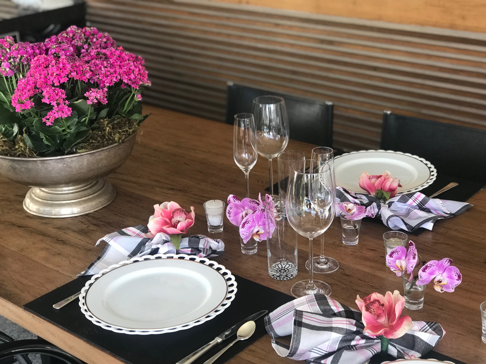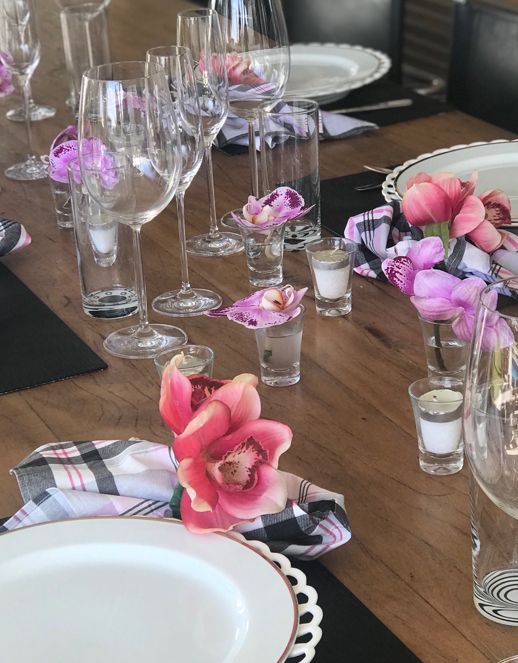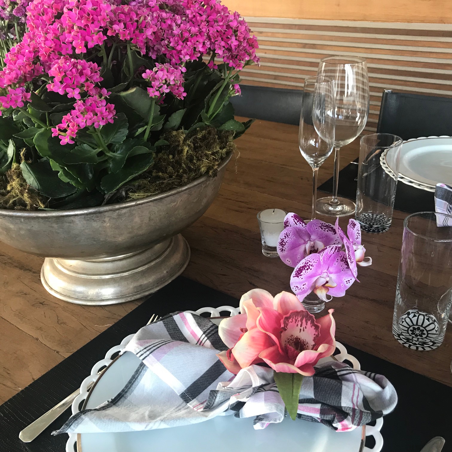 Pensei em algo bem neutro para valorizar as flores . O jogo americano de couro preto foi a base para a louça branca. Adicionei geometria nos guardanapos e no fundo dos copos de água. Como seríamos apenas 6 e a mesa é grande, coloquei um arranjo pink no final só para compor. Essas flores – KALANCHOE – custam R$6,00 cada vasinho e dessa forma, são ótimas para fazer um volume de cor.