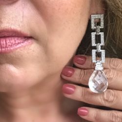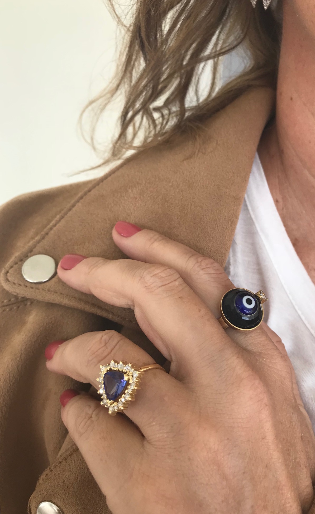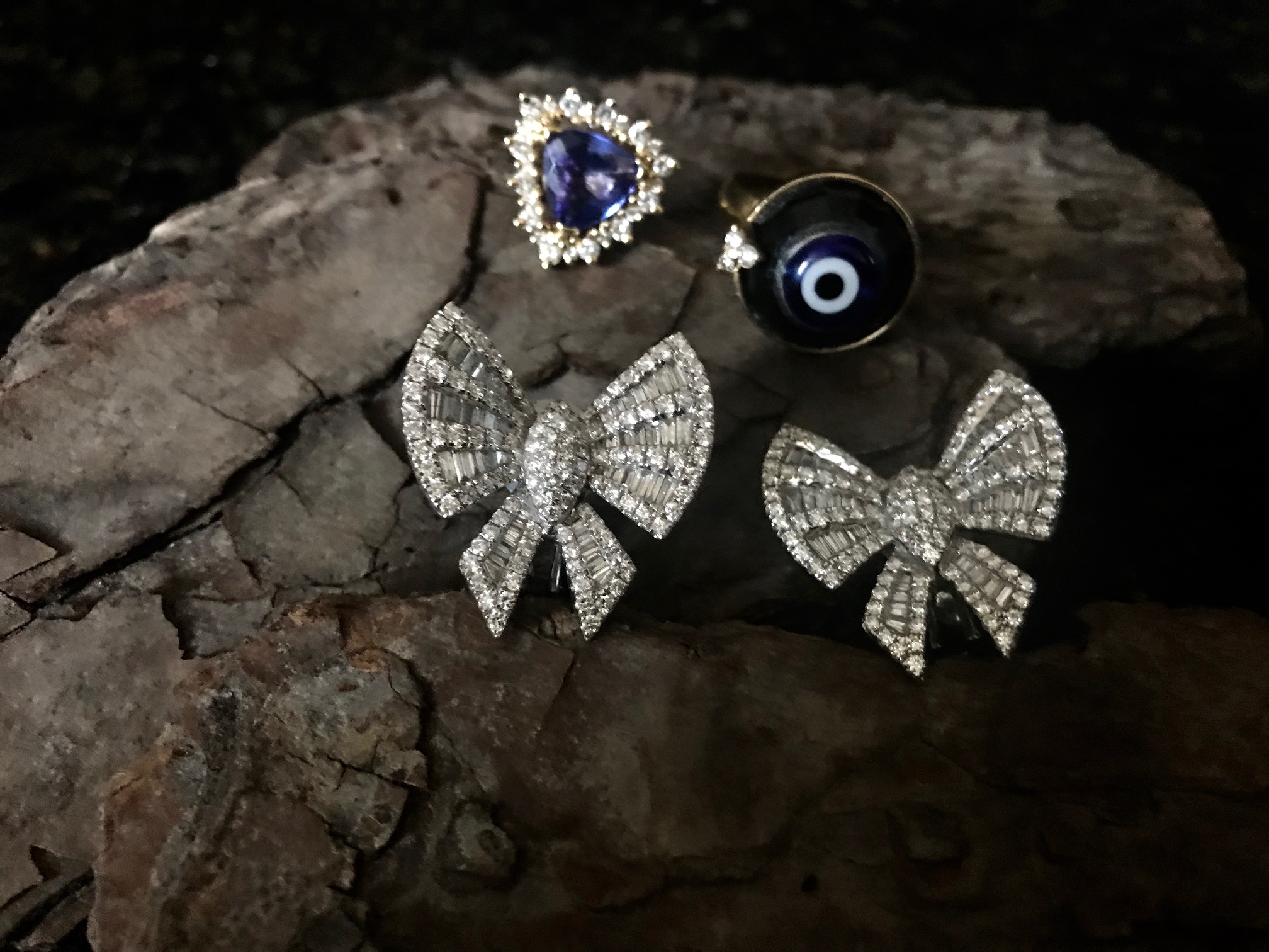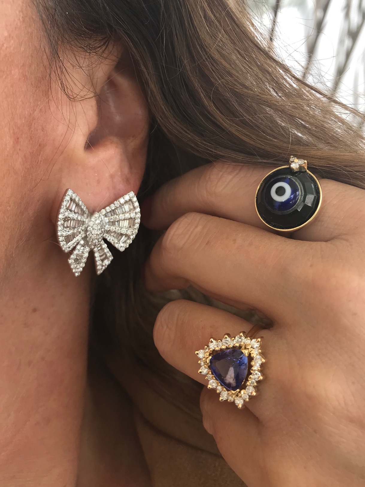 Fiz um mix de joias diferente: um brinco super poderoso em baguetes de brilhantes e 2 anéis que conversavam entre si pela cor ( o azul da iolita e do olho grego )