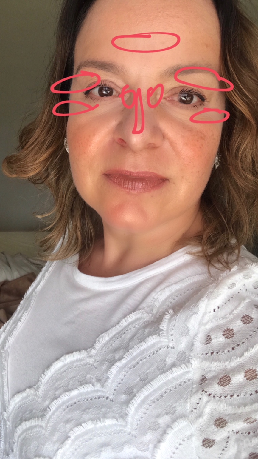 Na área dos olhos, usei o ULTRA NATUREL para corrigir e uniformizar linhas e pontos mais escuros. Já nas áreas marcadas em vermelho abaixo, usei o HD. Além de corrigir, ele ilumina com tecnologia específica para isso.