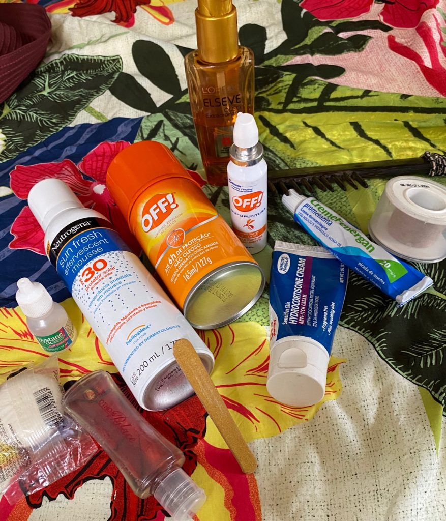 Vou passar a minha listinha, para quem sabe orientar a sua para da próxima vez não esquecer nada! Levo protetor 30 para o corpo, óleo para o cabelo e pente largo para quando sair do mar . Além disso, levo repelente e ainda pomadas para picadas, visto que sou alérgica a elas e dá um calombão na mesma hora. Lixa de unha e colírio para emergências e micropore caso meu pé se machuque, pois tenho pele sensível e sofro com areia quente , tiras de chinelo etc etc