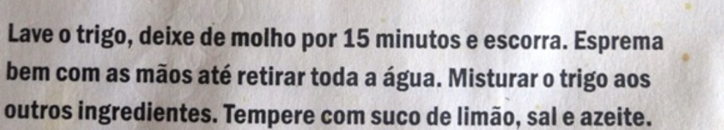 PREPARO: Deixe o trigo de molho por no minimo 2 horas e depois escorra-o bem, espremendo com as mãos. Lave em água corrente.