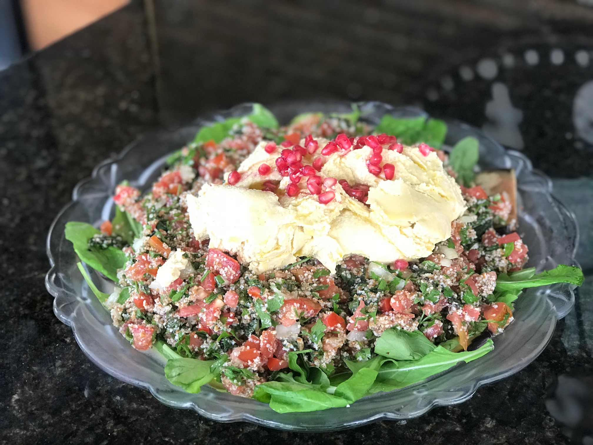 Coloque as fatias de beringela, por cima a rúcula, depois o tabule, depois o hummus. Salpique sementes de romã.