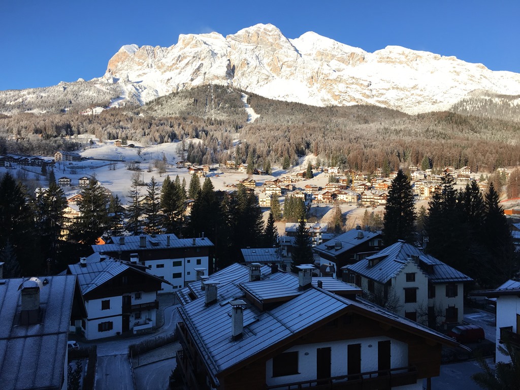 Dois grandes motivos atraem visitantes a Cortina d’Ampezzo: em primeiro lugar, os esportes de inverno – o local é a principal estação de esqui da Itália. Em segundo, a maravilhosa paisagem e os picos nevados, visíveis de qualquer canto da cidade. Essa era a vista do nosso quarto, em hotel no centro de Cortina.