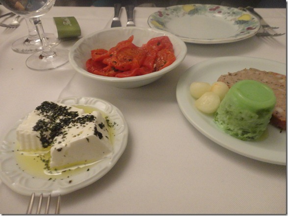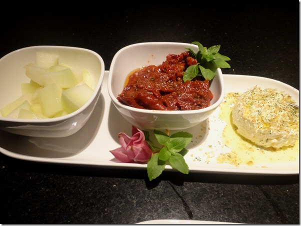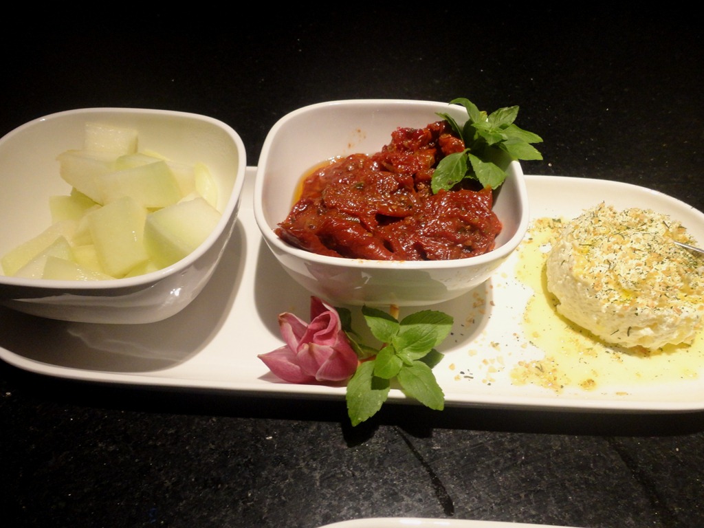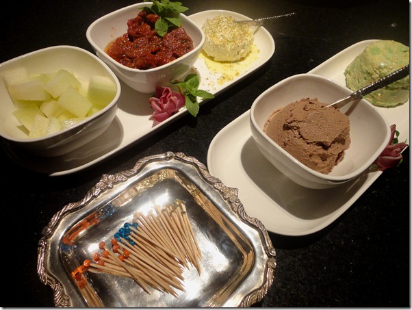 tomates assados – queijo com ervas – mousse de pepino – patê de foie – melão em bolas