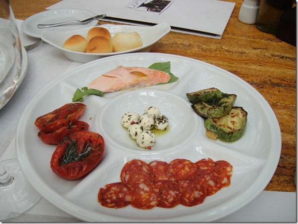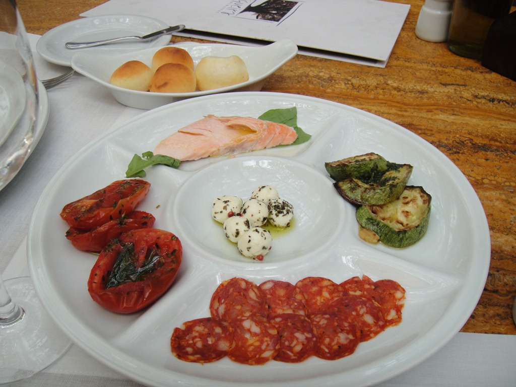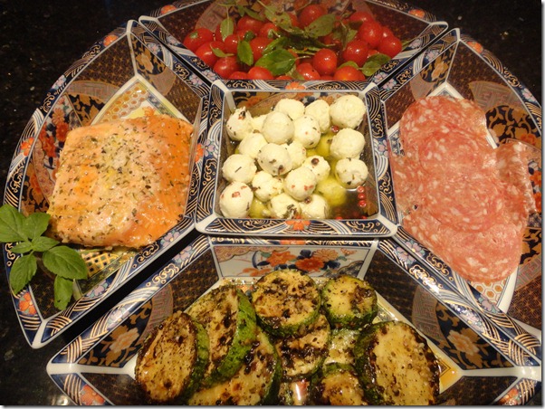 tomate assado – bolas de queijo cabra – salaminho –salmão grelhado- abobrinha grelhada