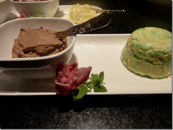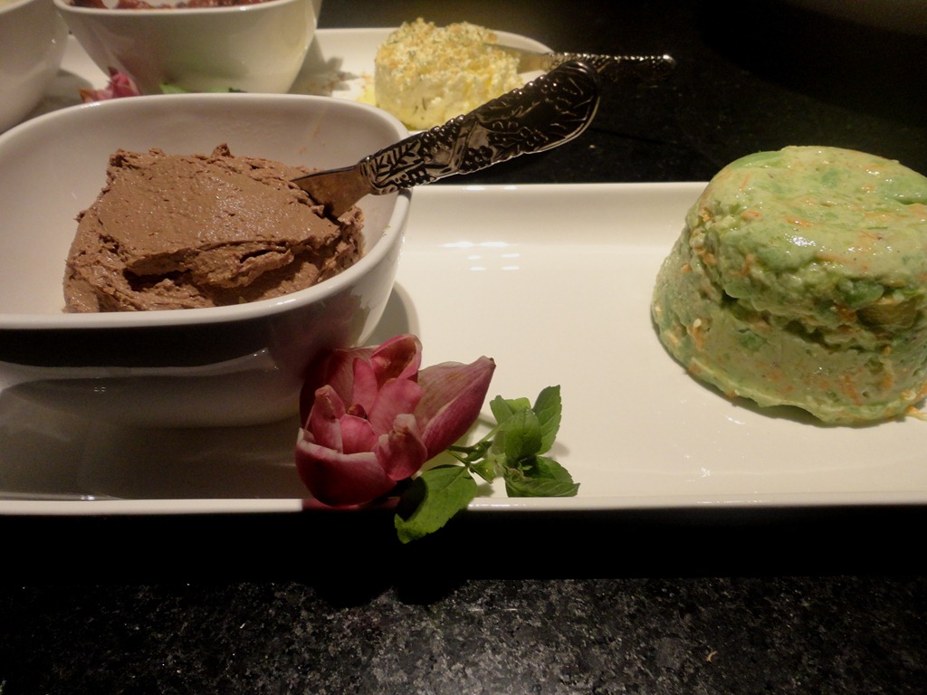 Patê de foie de lá também, e mousse verde que fiz .Faço sempre em mini-potes, congelo , e tiro uma por vez , pois é uma receita de forma inteira. Assim poupo tempo e trabalho.