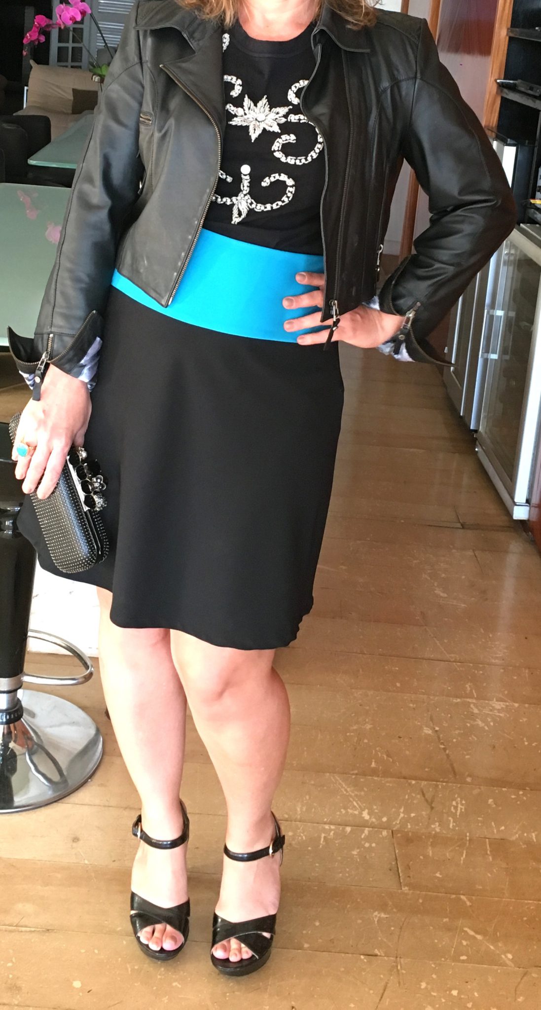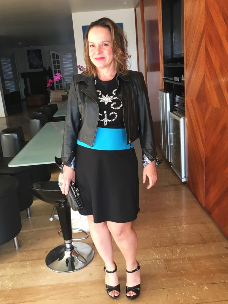 jaqueta CLÔ – t-shirt DENISE VALADARES – saia e sandália acervo – clutch ALEXANDER MCQUEEN