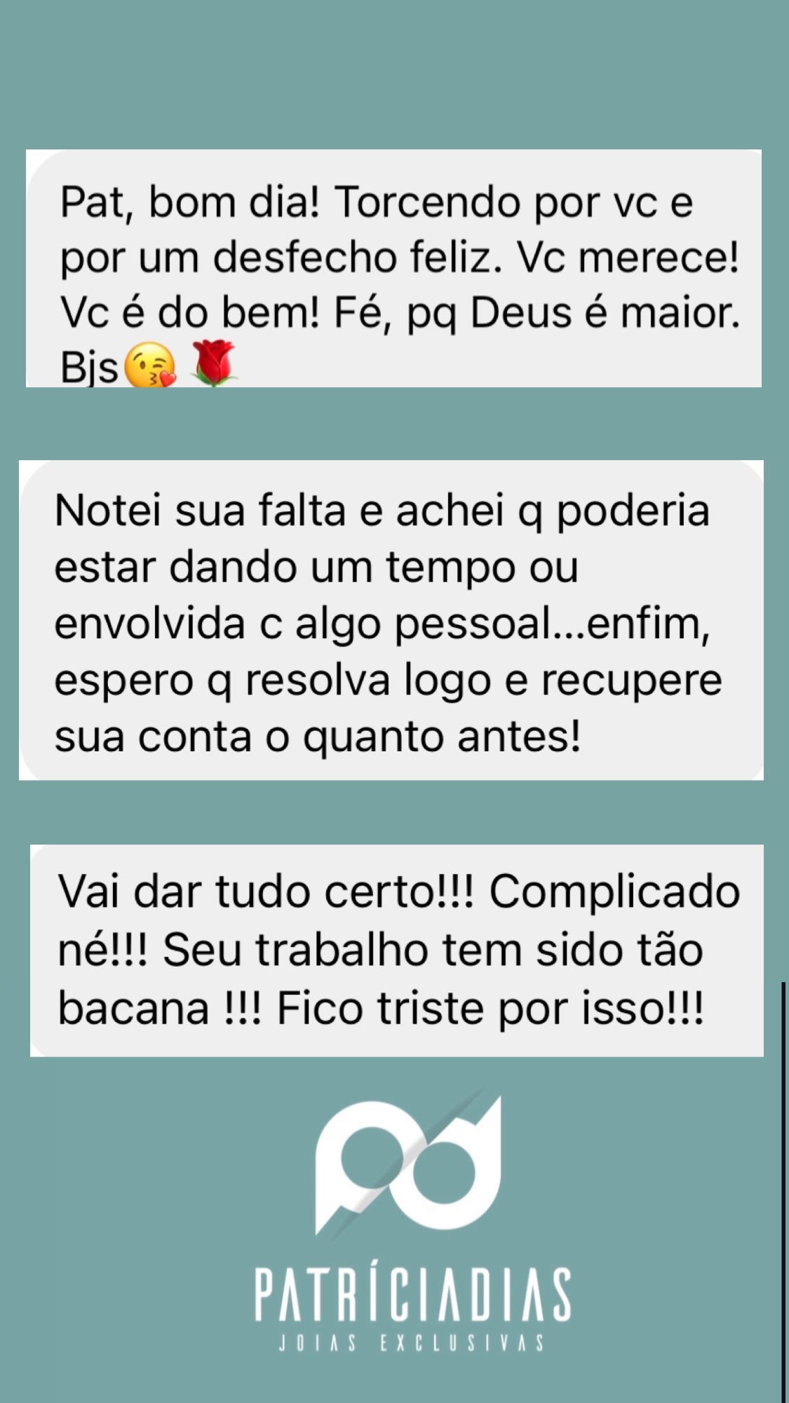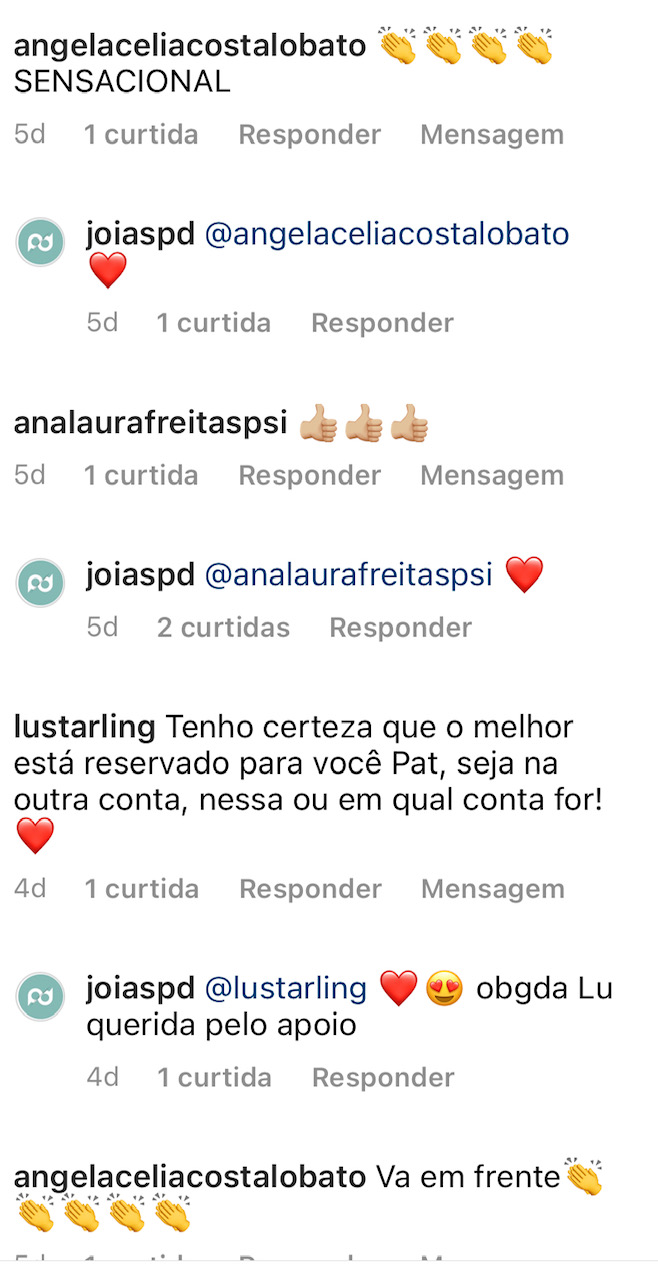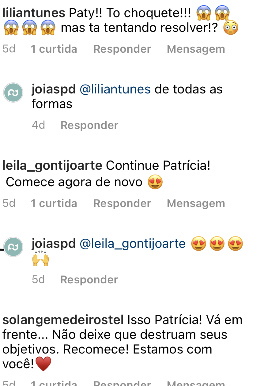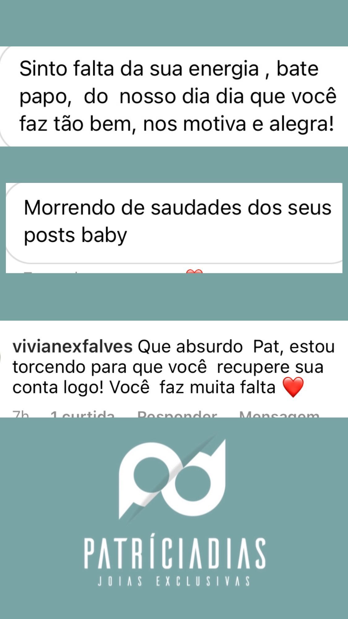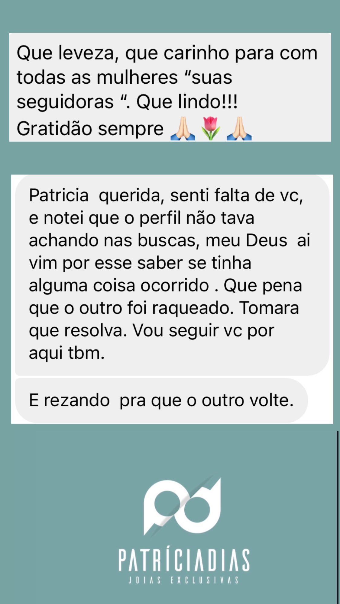 Lá encontrei minha voz. O @JOIASPD mostra as joias e o @PATDIAS_PD mostra uma mulher multifacetada e extremamente curiosa que se atreve a versar sobre vários assuntos. É nele que me jogo de corpo e alma e é nele que encontro vocês, seguidores inteligentes e carismáticos, que assim como eu, querem mais da vida.