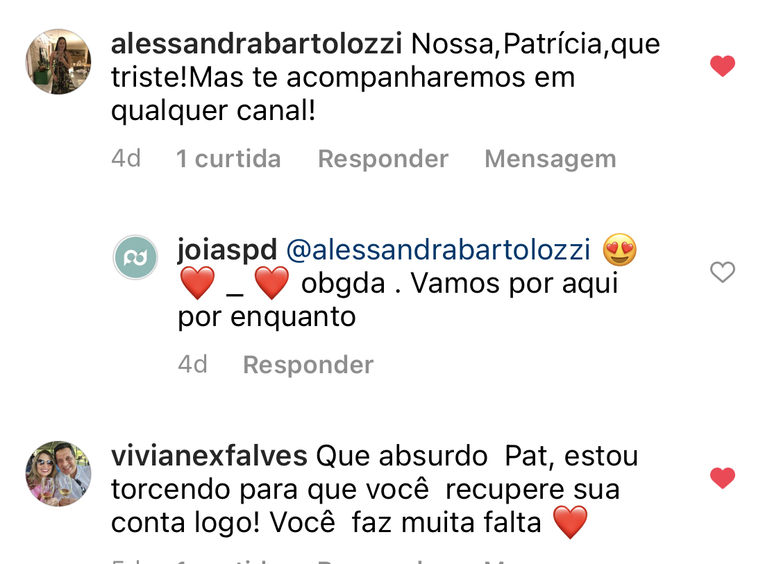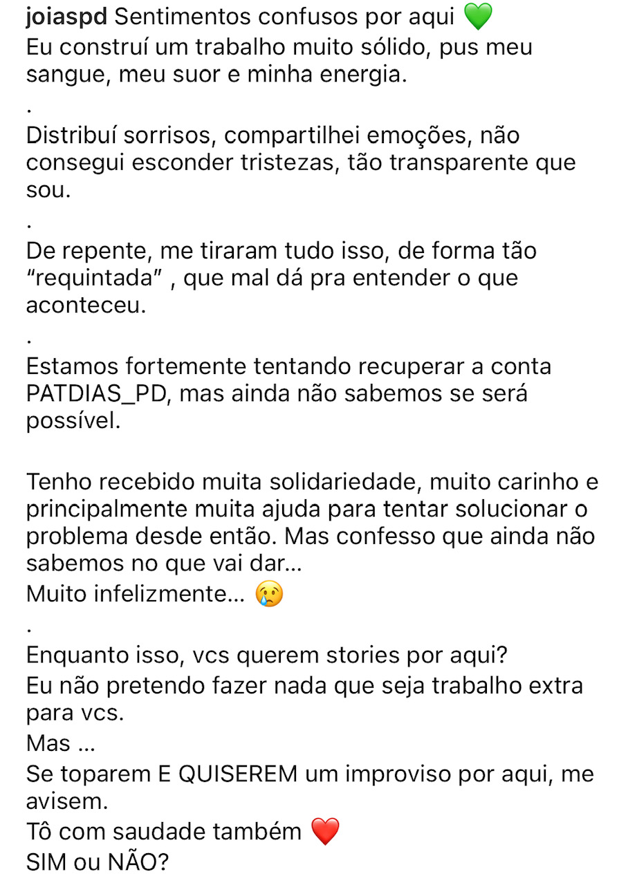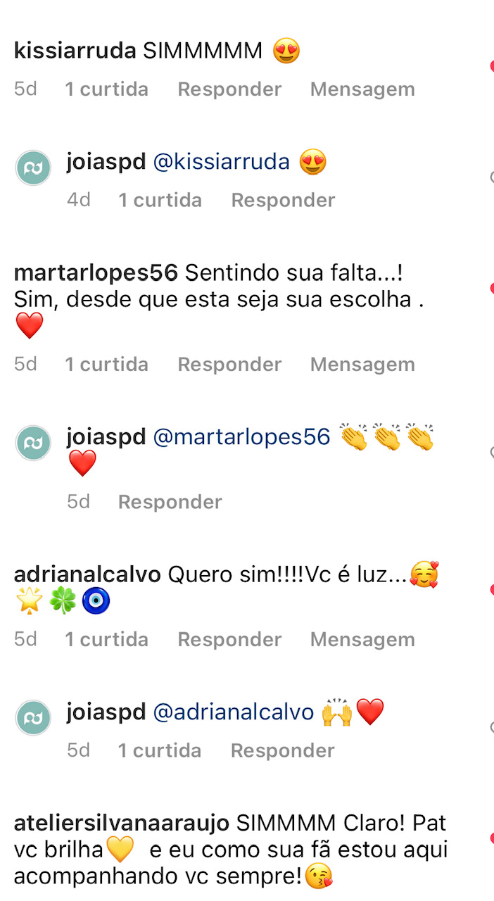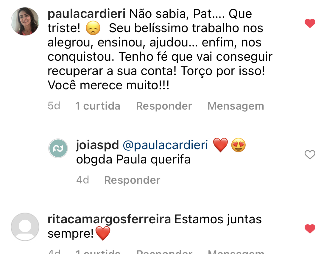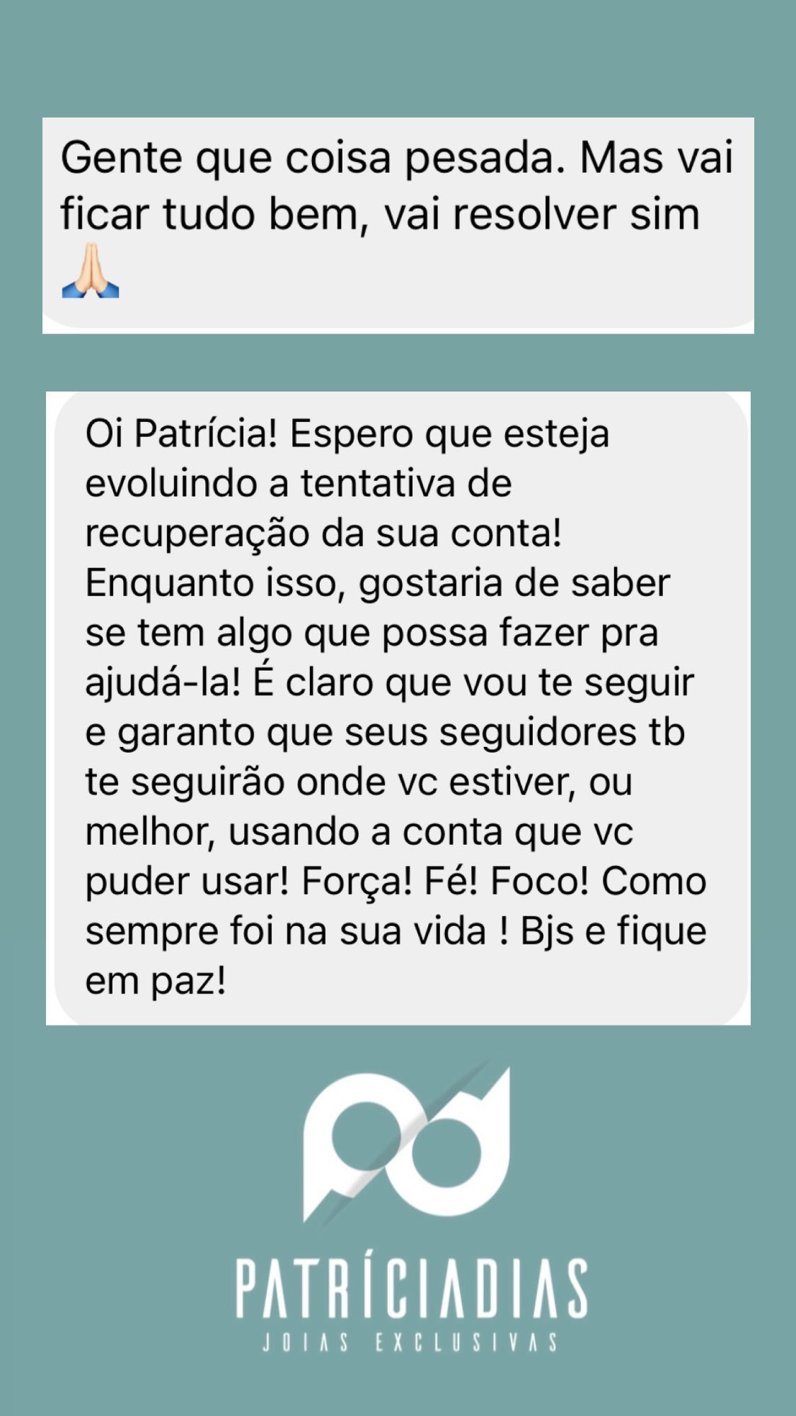 Lá encontrei minha voz. O @JOIASPD mostra as joias e o @PATDIAS_PD mostra uma mulher multifacetada e extremamente curiosa que se atreve a versar sobre vários assuntos. É nele que me jogo de corpo e alma e é nele que encontro vocês, seguidores inteligentes e carismáticos, que assim como eu, querem mais da vida.