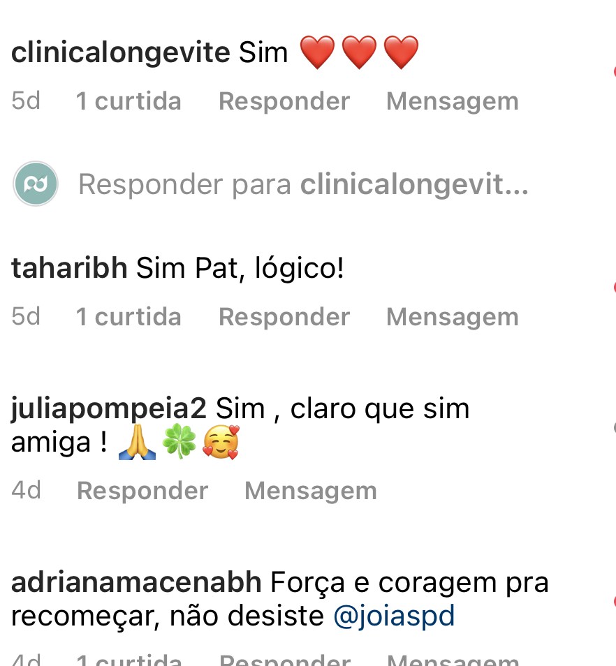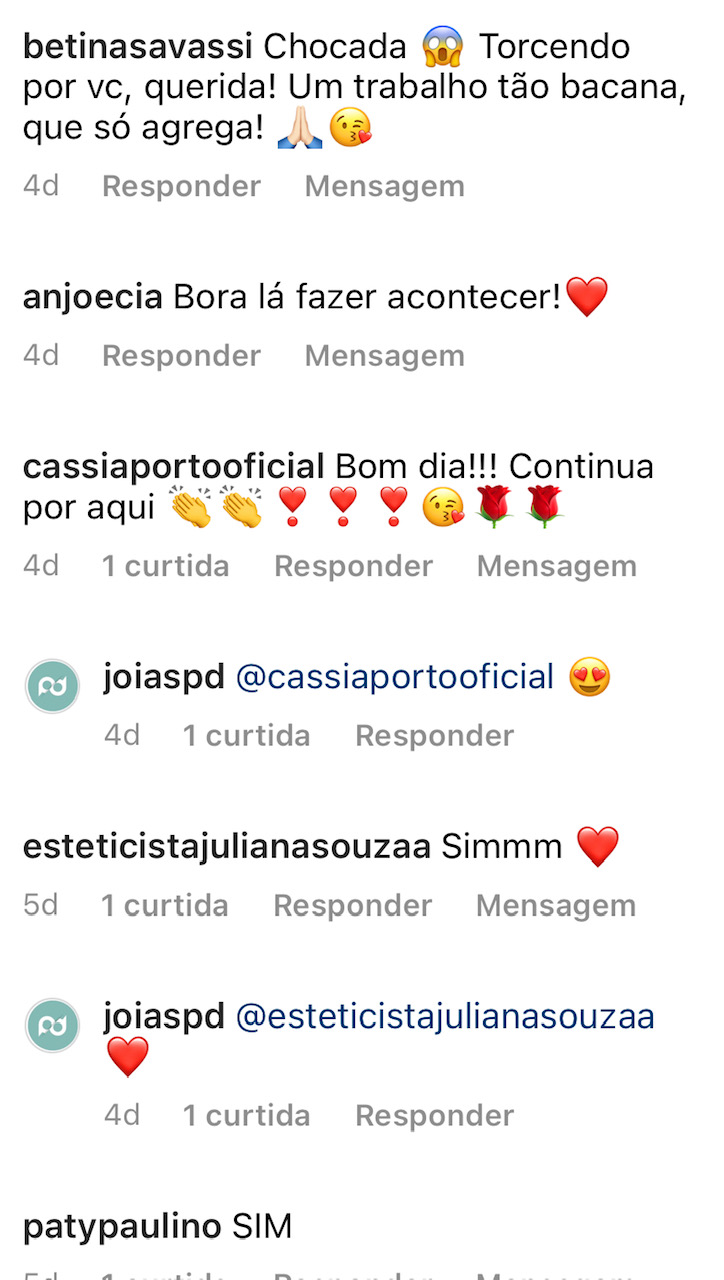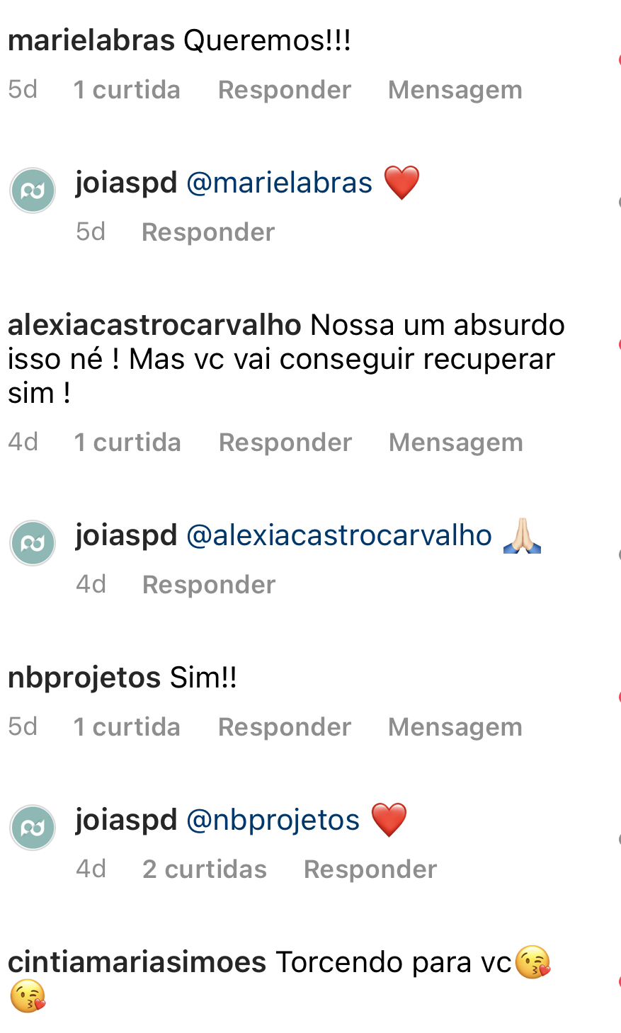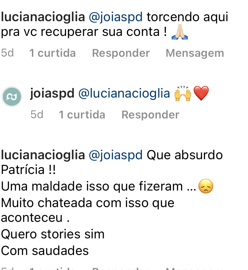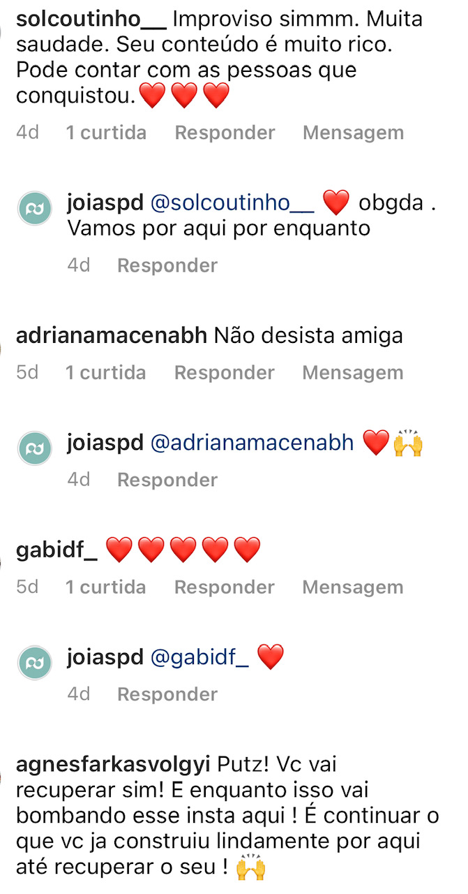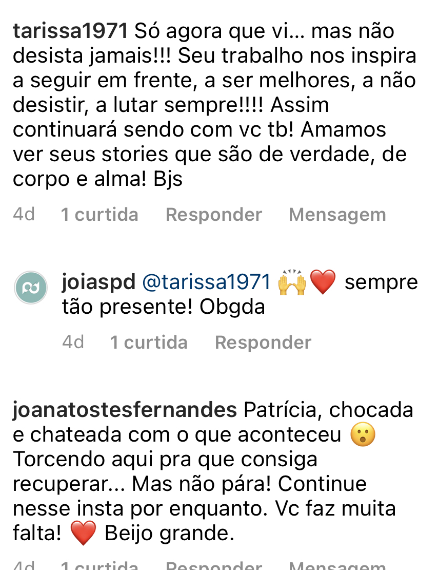 Lá encontrei minha voz. O @JOIASPD mostra as joias e o @PATDIAS_PD mostra uma mulher multifacetada e extremamente curiosa que se atreve a versar sobre vários assuntos. É nele que me jogo de corpo e alma e é nele que encontro vocês, seguidores inteligentes e carismáticos, que assim como eu, querem mais da vida.