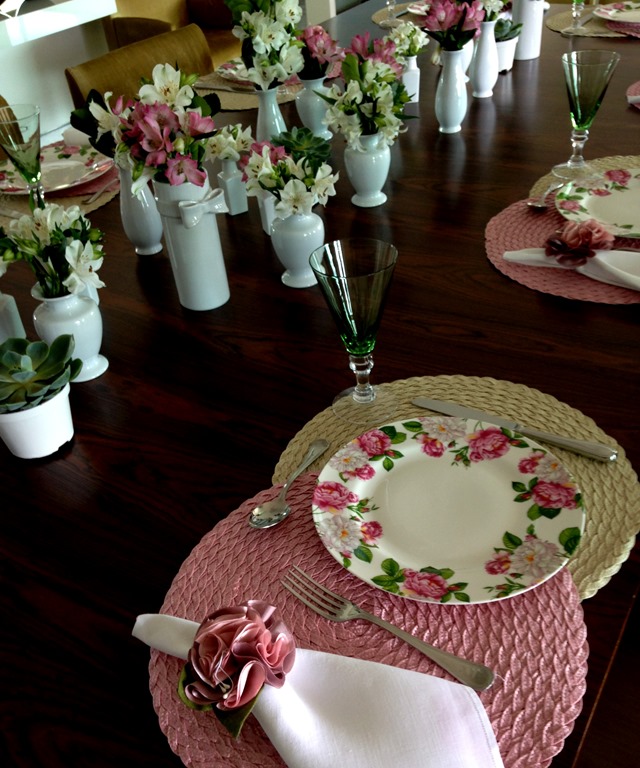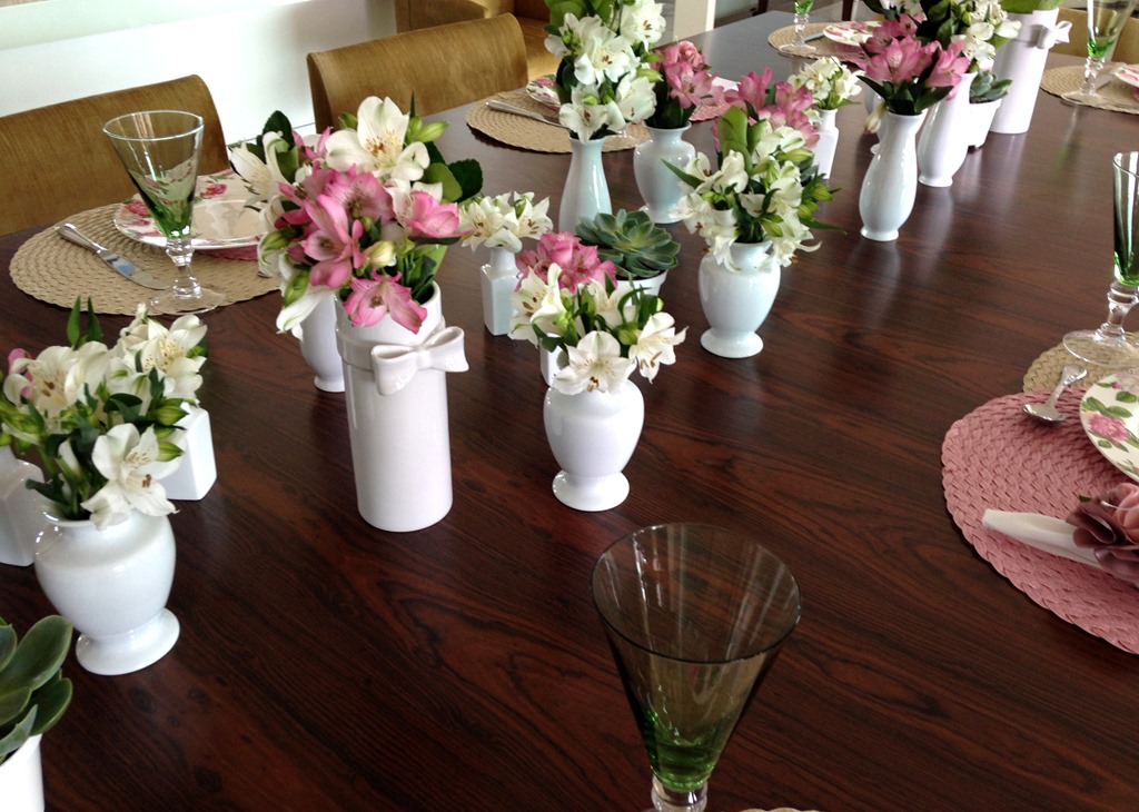 E mais : grandes anfitriãs são grandes colecionadoras de ítens que fazem toda a diferença em uma mesa. Nessa ocasião, ela pensou nesses mini- vasinhos e comprou eles aos montes, para que a mesa ficasse preenchida de flores e cor!