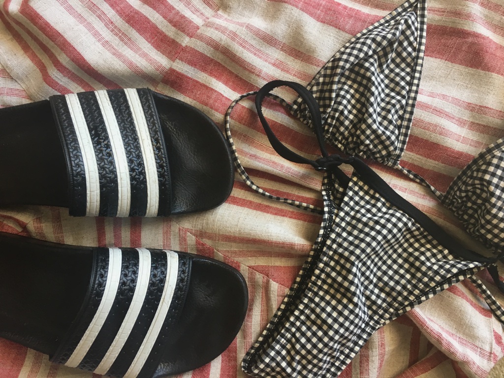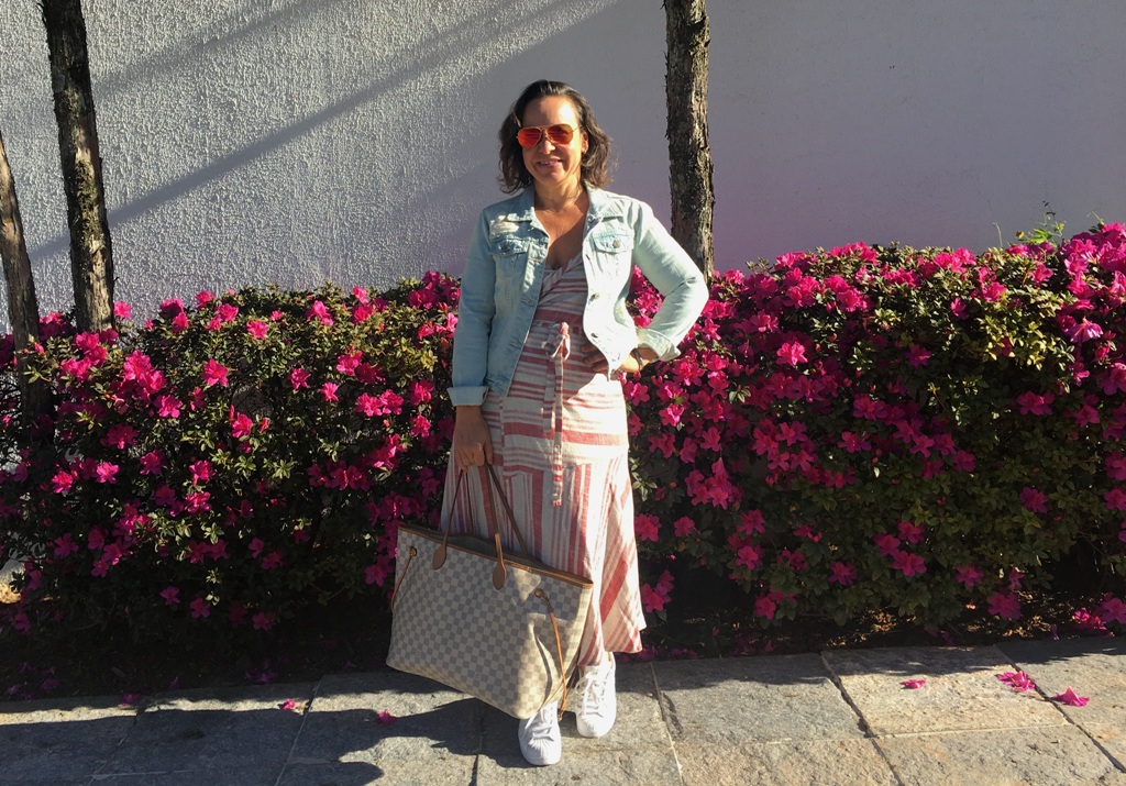 O meu não é bem um “xadrez”, mas tem essa cara campestre de “toalha de piquenique” que é totalmente esse mood. Usei com tênis e bolsa grande, já sabendo que tudo isso será repetido lá. Inclusive, o vestido será usado como saída, pois eu tenho um biquini xadrezinho de preto que vai “cantar”.